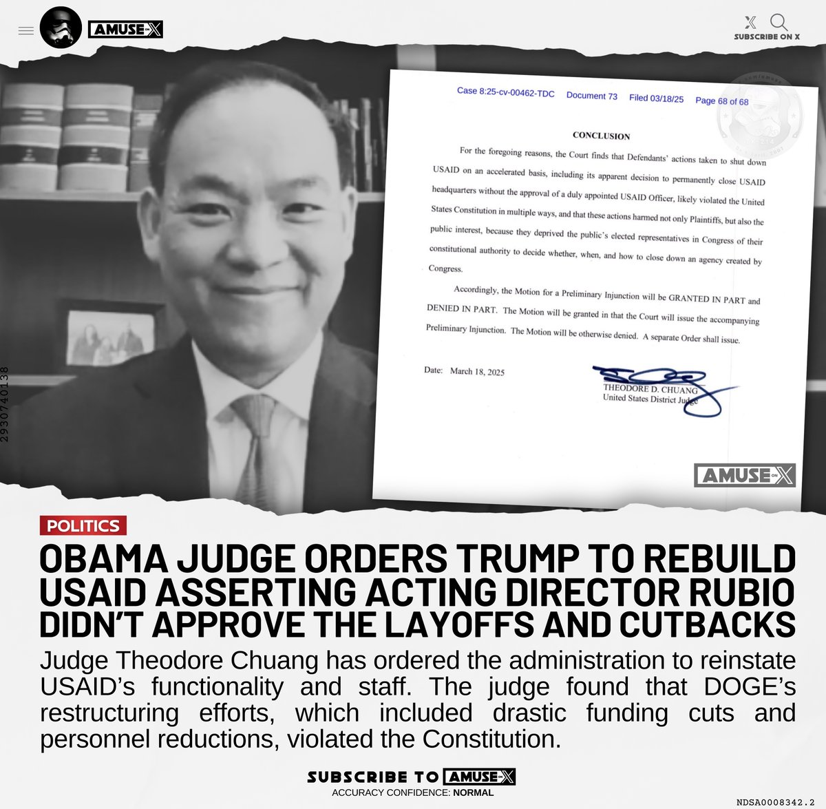 🚨🇺🇸 FEDERAL JUDGE TAKES OVER USAID HIRING — BLOCKS TRUMP PICK Judge Theodore D. Chuang has barred Jeremy Lewin, a former DOGE team member, from becoming Deputy Administrator of USAID. Instead of letting the administration make its own staffing decisions, Judge Chuang decided Lewin’s loyalty to Trump disqualified him. Government lawyers asked for clarity — the judge flat-out denied it and warned he could expand the ban if they try any workarounds. In effect, one judge is now acting as the self-appointed HR department for the federal government... Source: @amuse