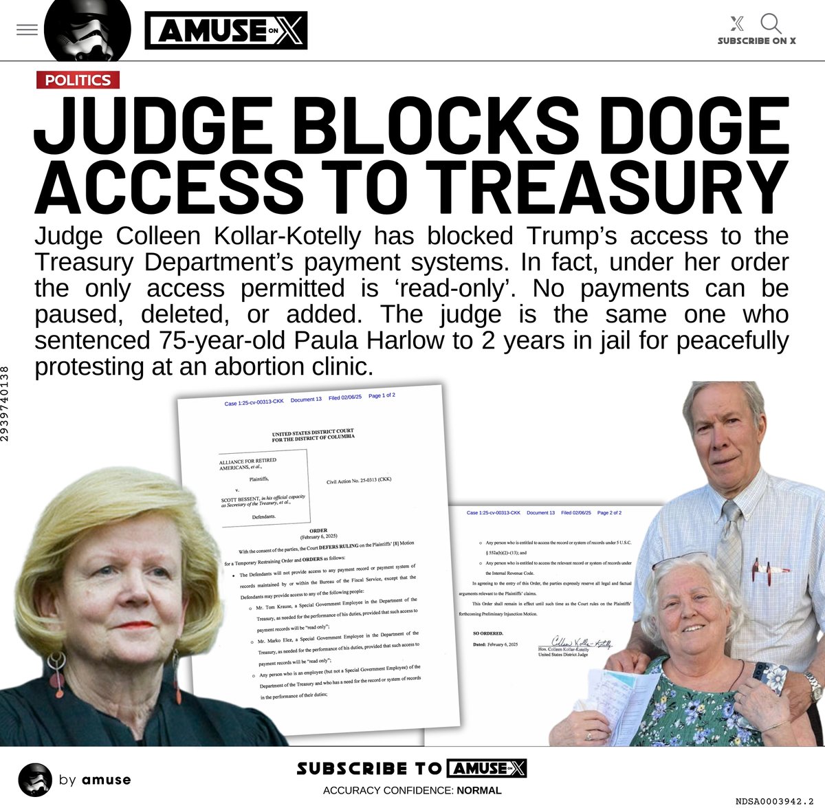 DOGE: 81yo Judge Kollar-Kotelly is the same judge that sentenced 75yo pro-life protester Paula Harlow to two years in prison. Now she's blocking Trump's administration from making changes to the Treasury Department's payment system. DOGE is blocked completely and Treasury officials have 'read-only' rights. This means that, if Trump's team follows the rules, no one can pause, delete, or add a payment. This is no way to run a government. Also, the DOJ lawyer handling the case for the Trump administration is the same one that was involved in the case that provided a $2M settlement to Peter Strzok and Lisa Page. The swamp is deep - keep draining Mr. President.