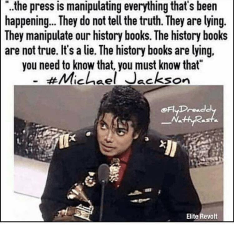 🚨🚨🚨The great Michael Jackson👇 : “The media does NOT tell the TRUTH - They are LIARS” “They manipulate our history books. Our history books are NOT true, they are filled with LIES - You need to know that. You MUST know that.” “We have to do something about it. WE HAVE TO!!” https://t.co/pqLX3u7Oj7