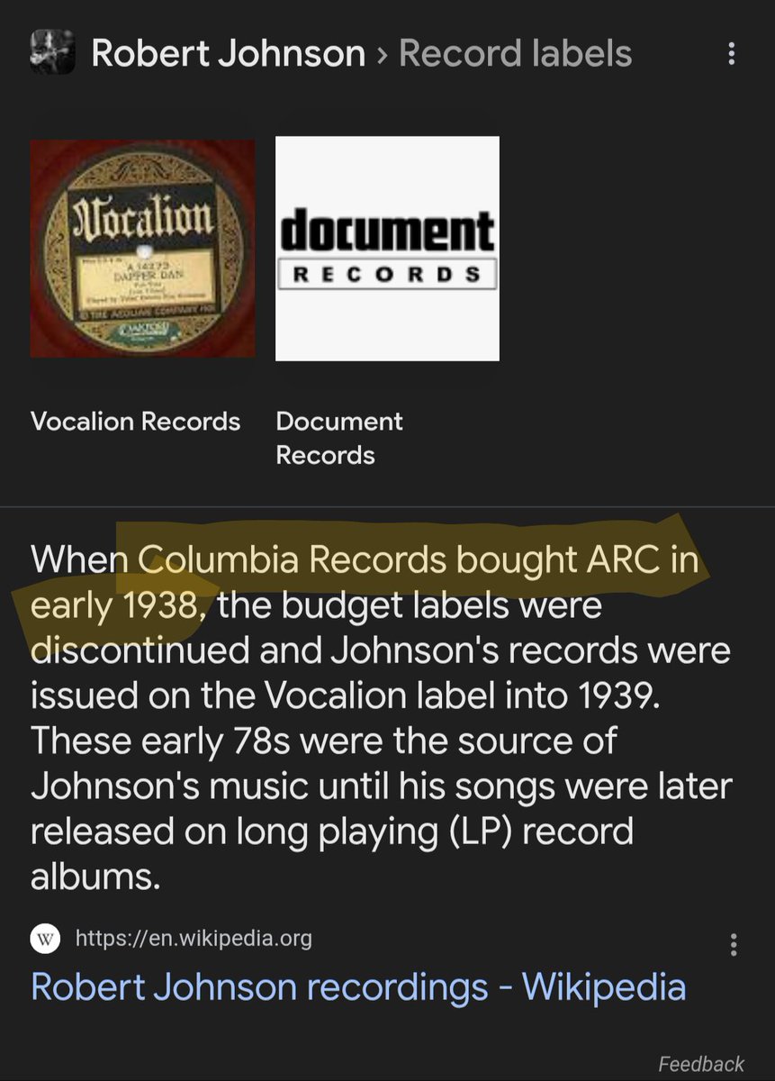 What's interesting is that Robert Johnson died just shortly before American Record Company sold to CBS. CBS placed Johnson's songs under Vocalion Records and issued Vocalion back to Warner Bros. And many of you know, CBS and Warner Bros. were owned by mafia jews at the time.