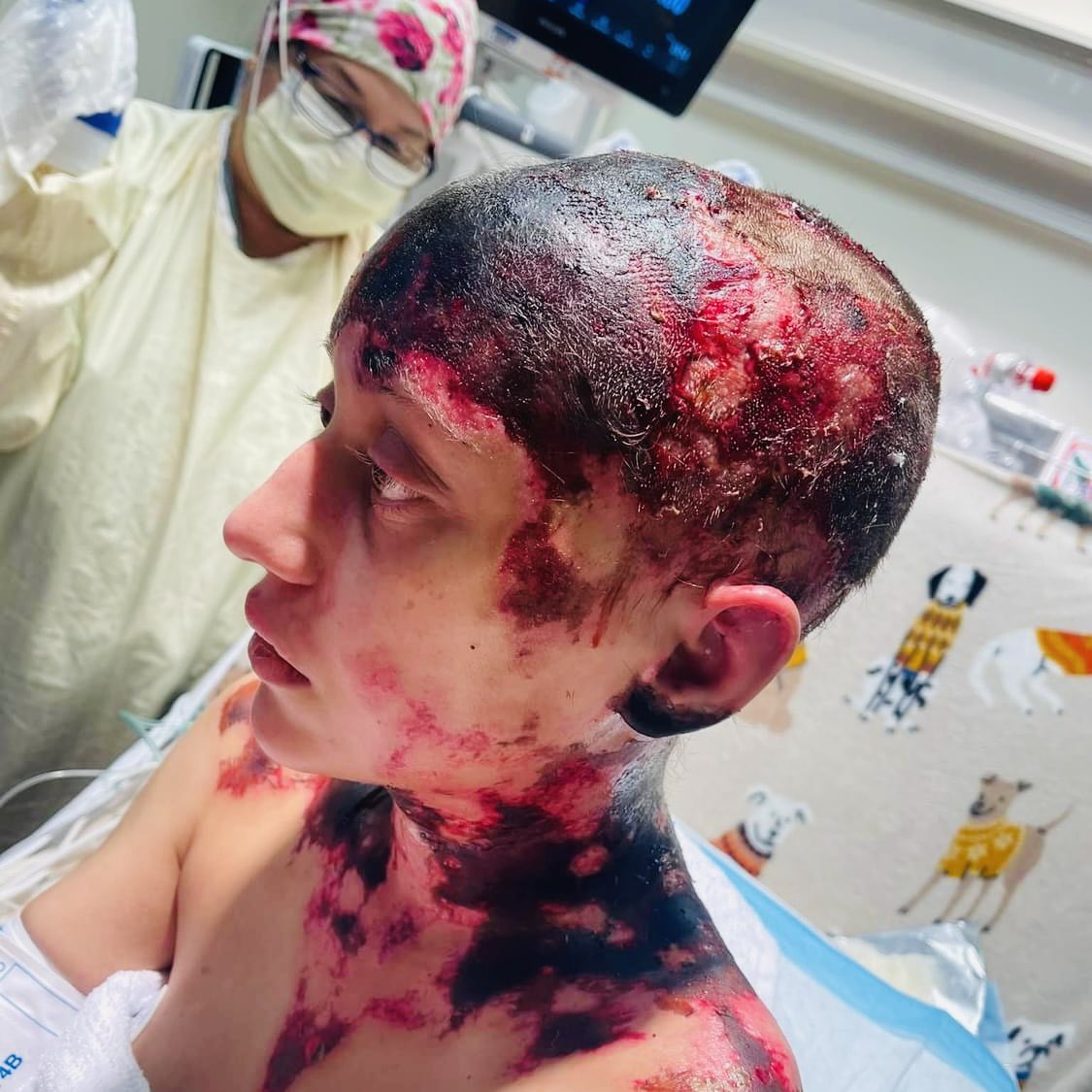 🏥 ALEXIS UPDATE 🚨 Lexi’s deep scalp scrub was very painful but went well. The burn team cleaned her head, allowing as much dead skin to be pealed off as possible, to allow new skin to grow. Alexis was blessed after with puppy therapy. This is the face of vaxx injury, but also of hope and resilience. Keep praying for Lexi 🙏