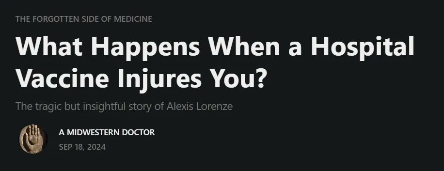 @MidwesternDoc The tragic reality is that Alexis’s situation is not unique. Vaccine injuries are frequently dismissed or downplayed, and those who suffer them often find themselves isolated and without recourse.