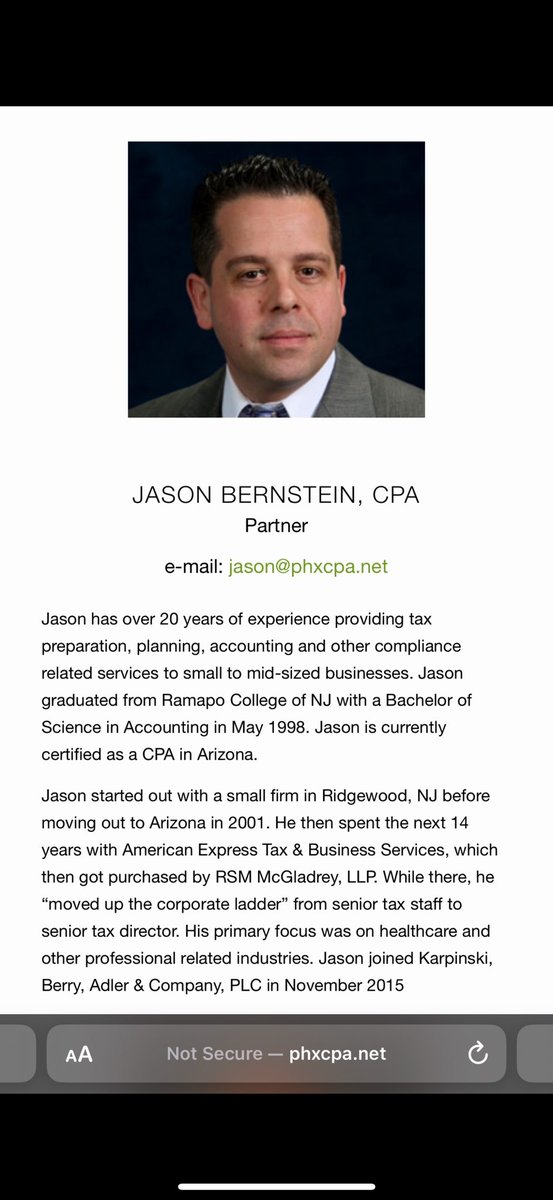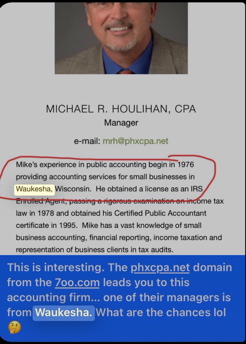 Waukesha, eh? Thank you for confirming the same exact fraud in Wisconsin and AZ that we exposed in 2022, @wisconsin_now. This helps us tremendously. KARPINSKY, BERNSTEIN & ADLER Certified Public Accountants (http://phxcpa.net) Here are the people who’ll be of highest interest for immediate criminal investigation: *Jason Bernstein *Charles Goldstein *Laurie Goldstein *Michael R. Houlihan *Robert Presler, Jr.