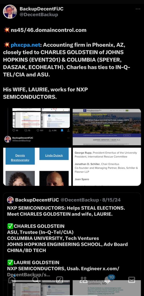 *Jason Bernstein is the direct connection between Charles/Laurie Goldstein and Karpinsky, Bernstein & Adler, P.L.C. *Charles Goldstein is a HUGE player in several major rackets — Columbia University, Arizona State University (Michael Crow, IQT/CIA), Johns Hopkins University and BD Tech (China). *His wife, Laurie Goldstein, is an Engineer with NXP Semiconductors, which is ALSO extremely important to the current plot.