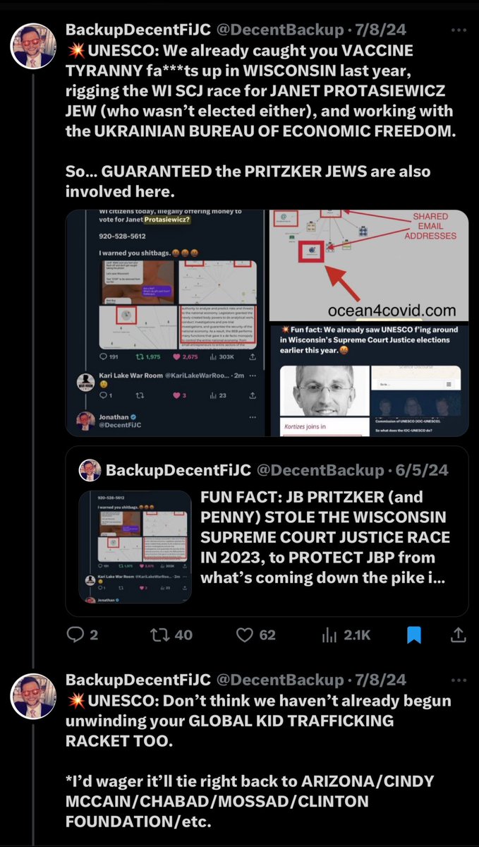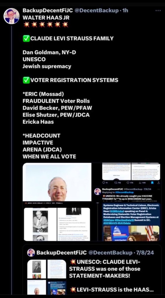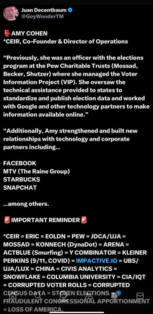 @EmeraldRobinson, My personal favorite is when they suspend your @DecentFiJC account with ~70,000 followers, more receipts on election fraud than anyone and one of the highest weekly engagements on the entire platform. All because you’re truly an independent, they can’t stop you from telling the truth, they can’t keep pace with the quality, volume and detail of your work, they hate the fact that you’re embarrassing all of their highly-monetized sacred cow mouthpieces and more than anything, you’re exposing THEM. So then, you create a @DecentBackup account, which soon reaches 30,000 followers of its own, and they suspend that too. But you keep going anyways. And now that you’re on alt account #8-9, and they’ve figured out “banning you” isn’t gonna work, they just start arbitrarily tossing “Hateful Conduct” labels on many of your more important exposés, so that nobody on @X can see/like/share them. A week or so later, they send out their newly-minted “astroturf cover-up” accounts to lift your “Hateful Conduct” shit verbatim, they pass it off as their own to monetize off it and garner “street cred” and then they have their dutiful Jewish “right-wing arbiters of investigation” like “I am extremely Jewish” @MikeBenzCyber fawn all over it like it’s the cure for cancer. Sometimes it’s @DataRepublican (Snapchat/Norwest/Lightspeed), sometimes it’s @NicoleShanahan (Google/Kleiner Perkins) and sometimes it’s just the plain ole NSA and @WarClandestine. But it’s all the same Judeo-Bolshevik bullshit.