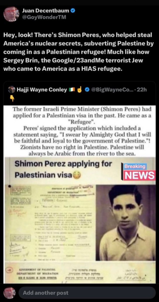 Reminder: That’s the same Shimon Peres who intentionally had a PALESTINIAN VISA so he could subvert PALESTINE from within as a “refugee”. https://t.co/wR9rsVxt9C