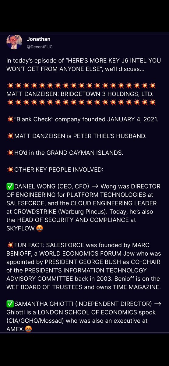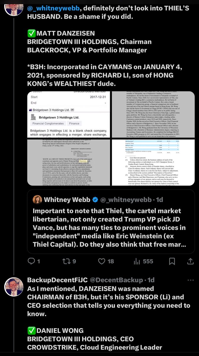 LI KA SHING (Hong Kong) Bridgetown III Holdings, Matt Danzeisen, Daniel Wong, Bilderberg, Sam Altman (who officiated the wedding of Jacob Helberg and Keith Rabois), Jen Easterly (CISA, Krebs, SentinelOne), etc. Peter Thiel is on the Bilderberg Steering Committee alongside Roger Altman and Marie-Josée Kravis (Henry Kravis; KKR).