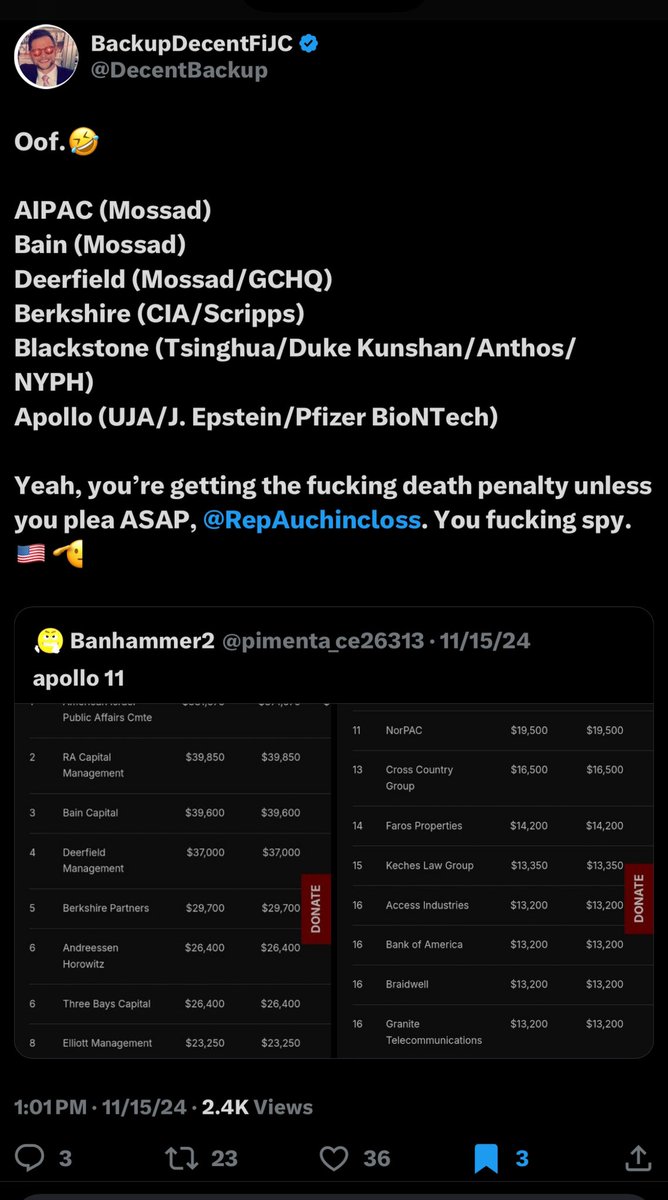 See if y’all recognize any of these donors to Rep. Jake Auchincloss, the son of HUGH AUCHINCLOSS: 1. AIPAC🤣 3. BAIN & COMPANY🤣 4. DEERFIELD MANAGEMENT (Somatus, Mt Sinai)🤣 5. BERKSHIRE (Scripps/CIA/Buffett)🤣 6. ANDREESSEN HOROWITZ 9. BLACKSTONE GROUP🤣 11. APOLLO GLOBAL MANAGEMENT🤣