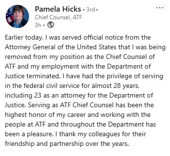BREAKING: Chief Counsel for the ATF Pamela Hicks, a Democrat donor, was just terminated https://t.co/z4kQqitXNM