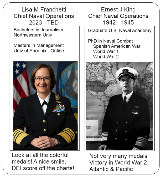 Admiral Lisa Franchetti, a journalism major turned naval officer, has been shit canned as Chief of Naval Operations (CNO). Her initial act in the role, allowing sailors to put their hands in their pockets. It’s hard to shake the suspicion that elevating figures like her to such high ranks was a deliberate move to undermine the military’s strength. You could not pick a more unqualified person to be CNO.