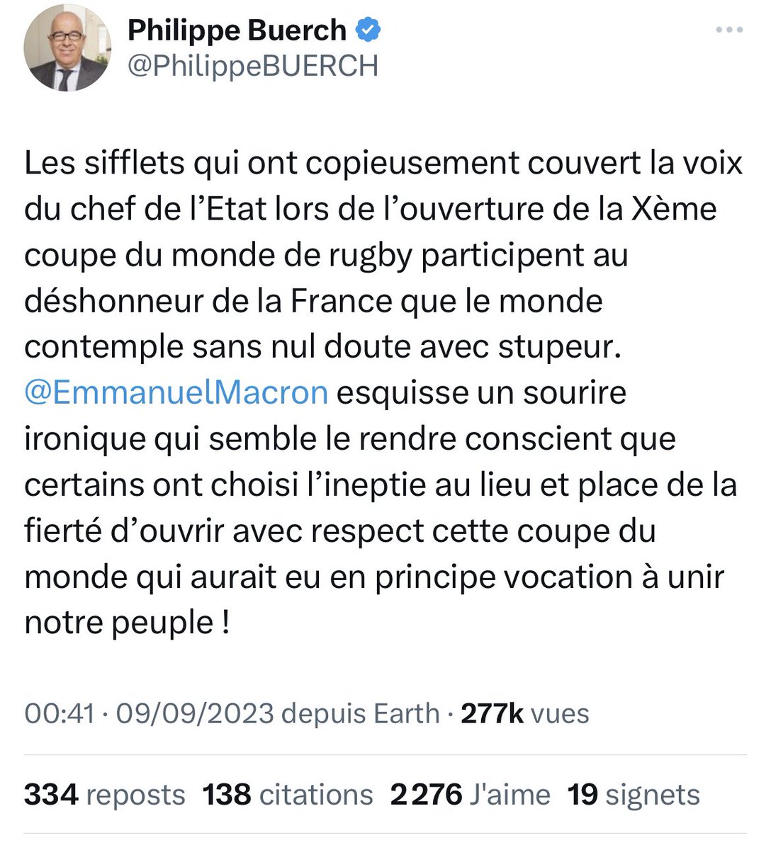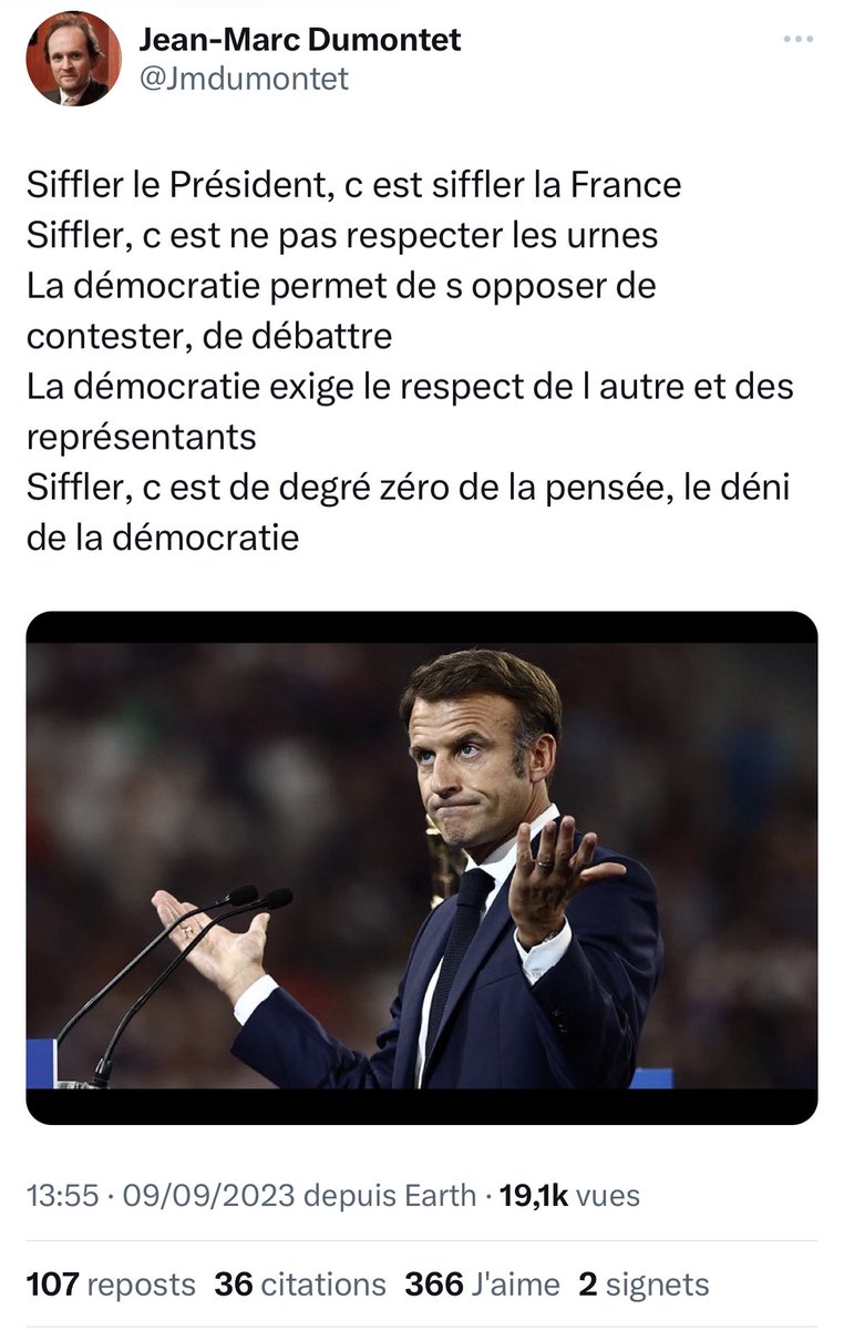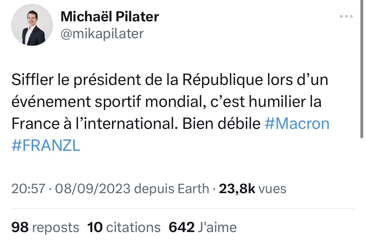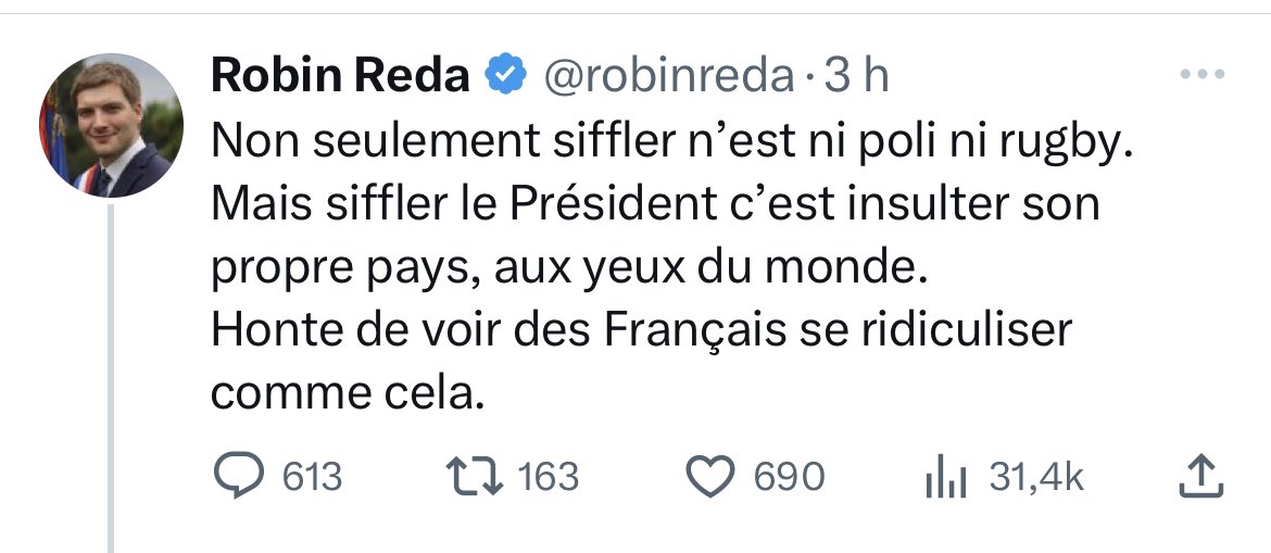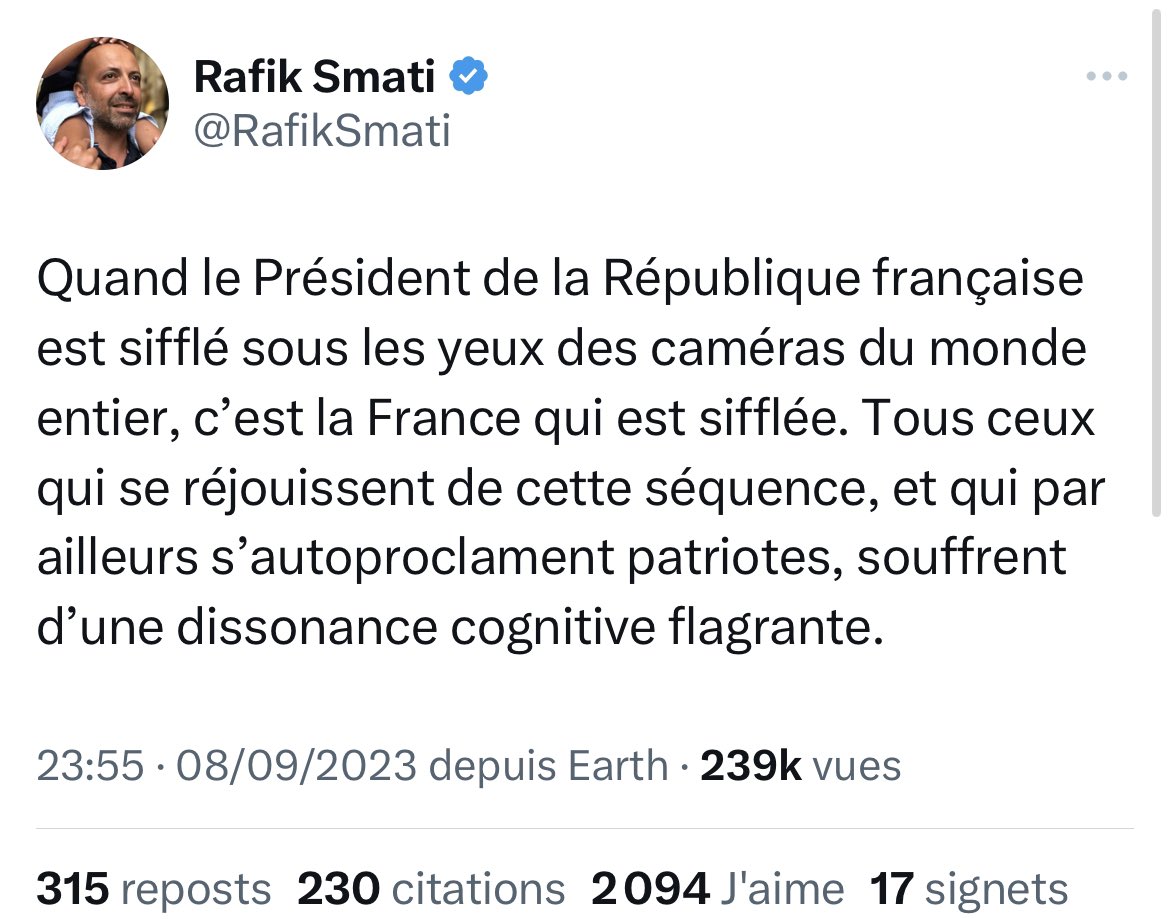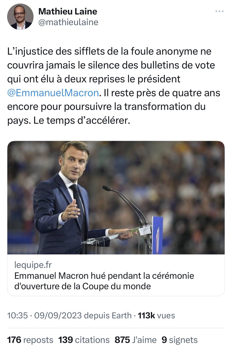 La petite séance d’astroturfing habituelle des comptes macronistes qui pensent que siffler Macron c’est se ridiculiser à l’international. Non, Macron se ridiculise très bien tout seul, en France ou ailleurs. https://t.co/6Uoa8MYKbf