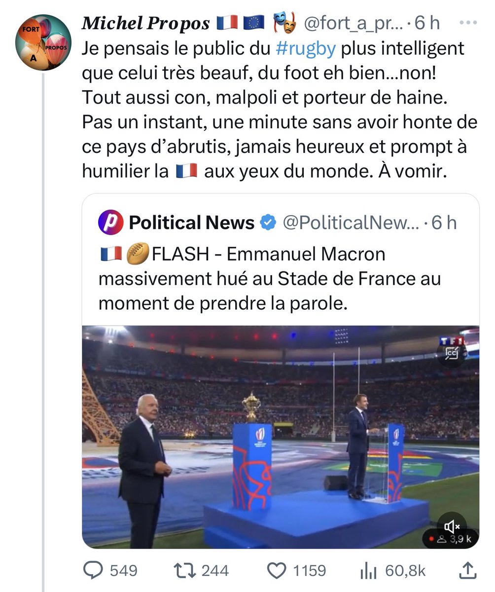 (suite) ça donne l'impression d'un match de rugby entre les bleus et les verts peut-être y aura t'il une 3 ème mi-temps dans les travées quand Macron sera parti ? https://t.co/GegpkD8Q4i