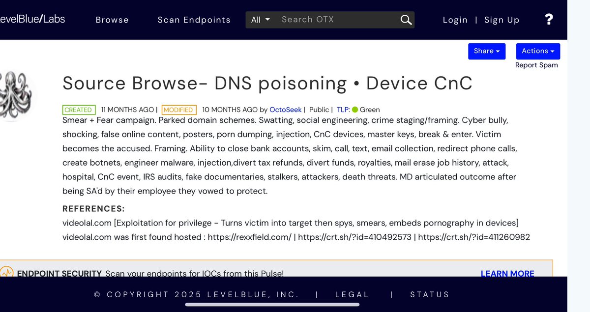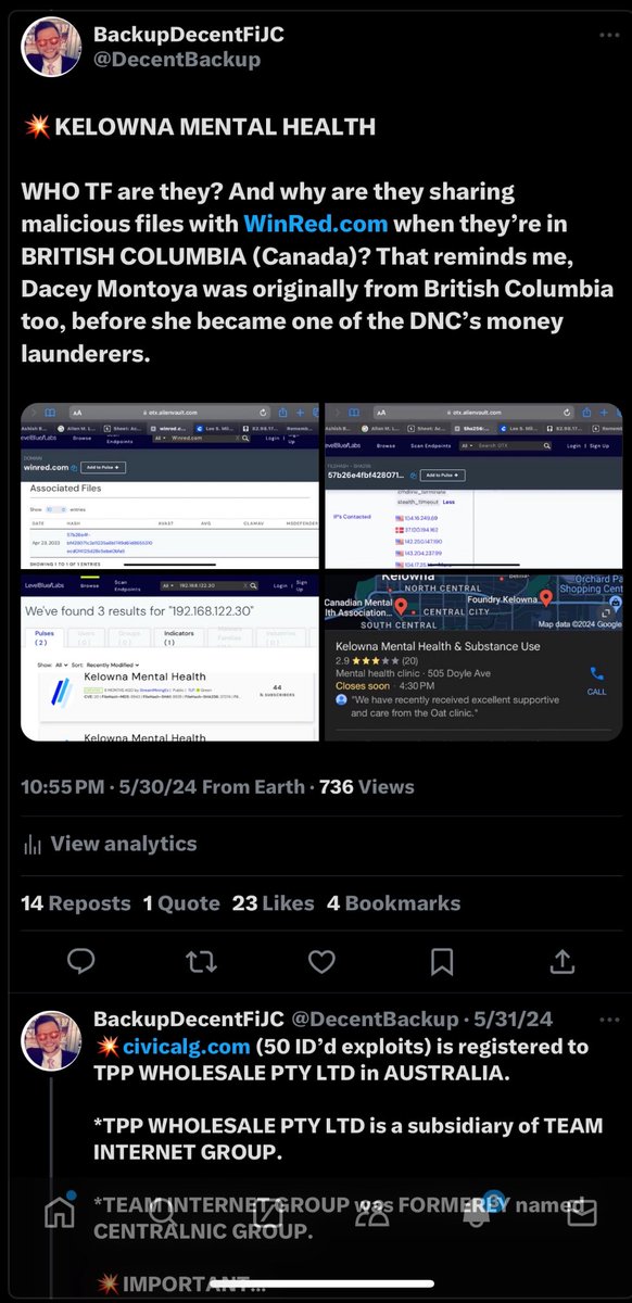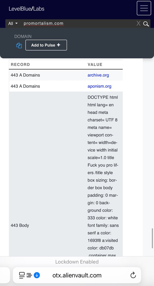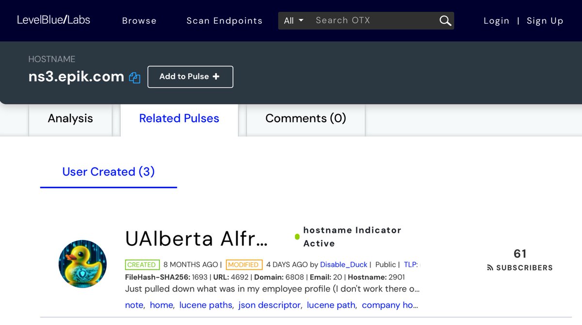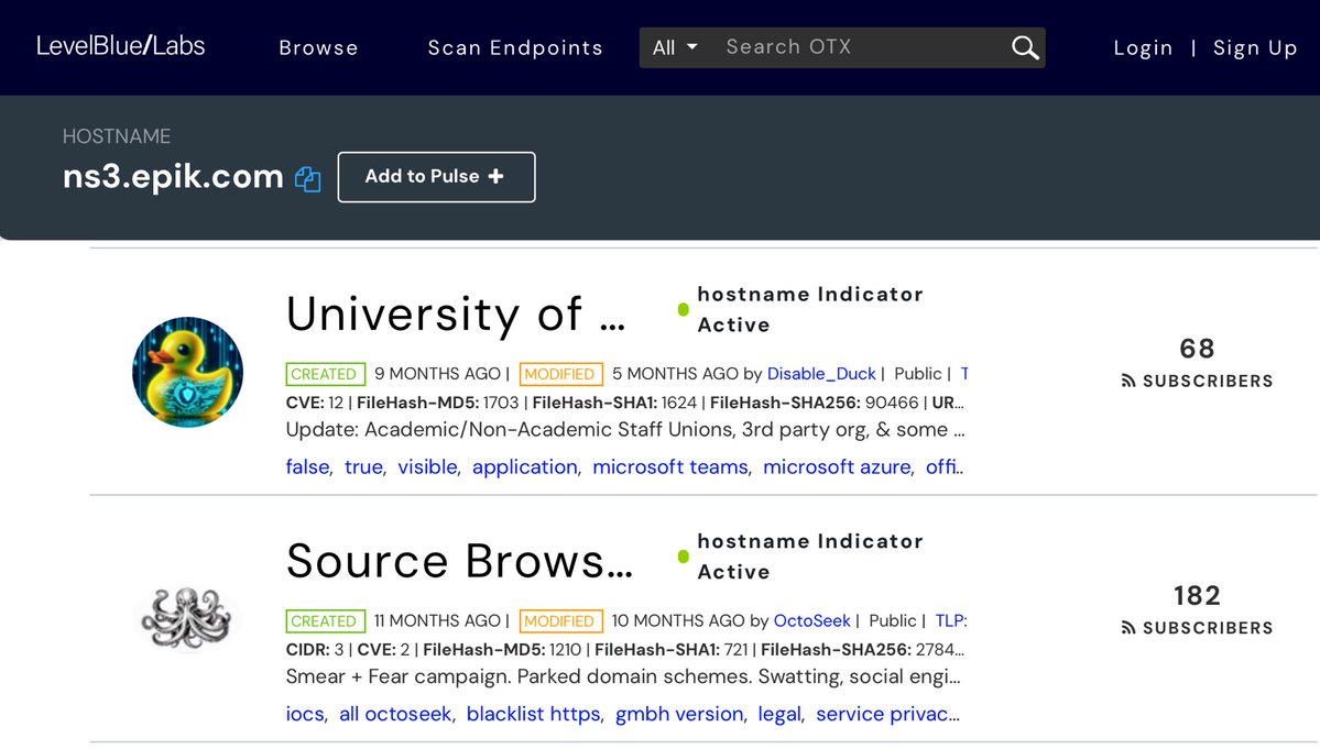http://ns3.epik.com (http://libertylinks.io NS) 3 PULSES (EXPLOITS/HACKS) 💥UNIVERSITY OF ALBERTA: https://otx.alienvault.com/indicator/hostname/ns3.epik.com (NOTE: The link above is to the http://ns3.epik.com AlienVault eval, because for some reason, I couldn’t get the direct link for the pulse to copy/paste.) Haven’t seen either of these two before.👇 💥UALBERTA ALFRESCO MANAGEMENT SOFTWARE ABUSE: https://otx.alienvault.com/pulse/6665315e25f9dd42a99e4f2f *Alfresco Management is a huge file, and looks like a massive document management (or mismanagement) exploit at UofA. Enjoy combing through that one. 💥SOURCE BROWSE - DNS POISONING • DEVICE CNC: https://otx.alienvault.com/pulse/65eedf74b7bdda41057bef3e *This one just looks vile as fuck.😒