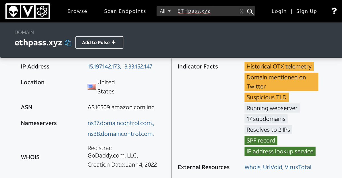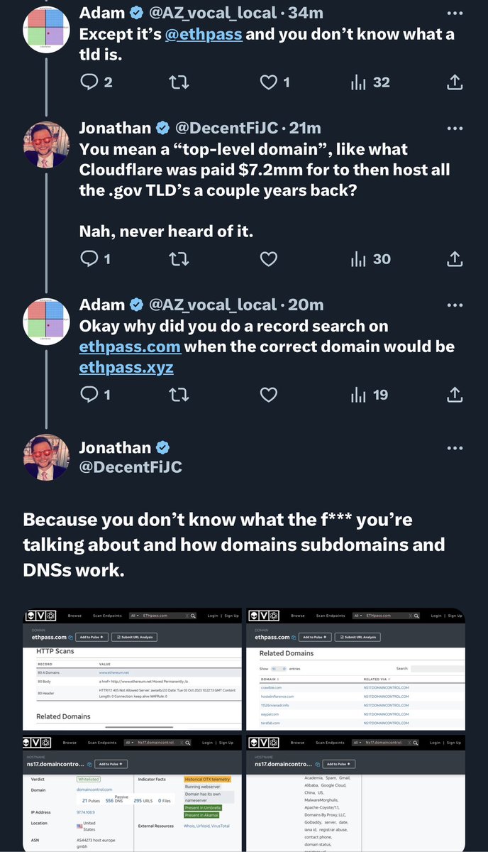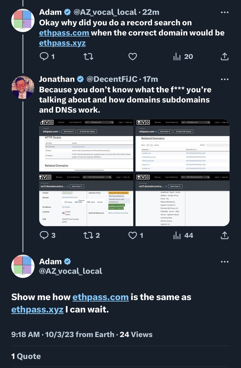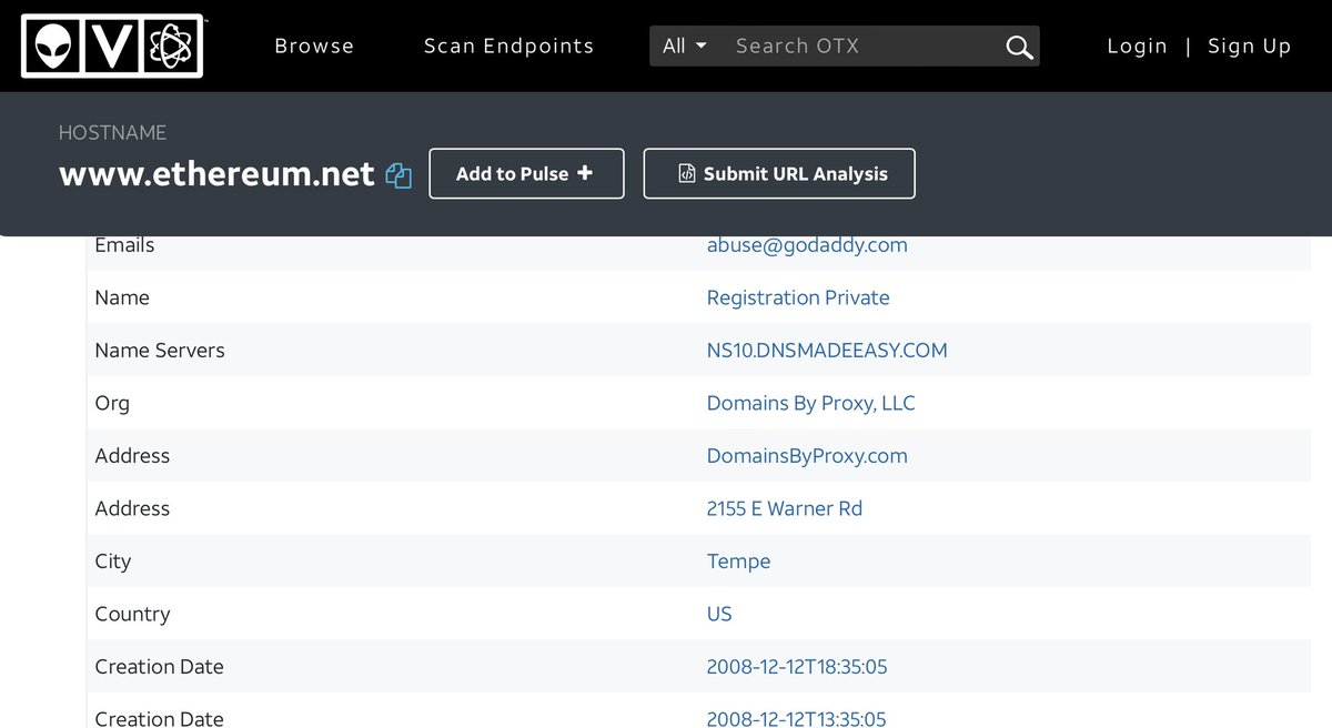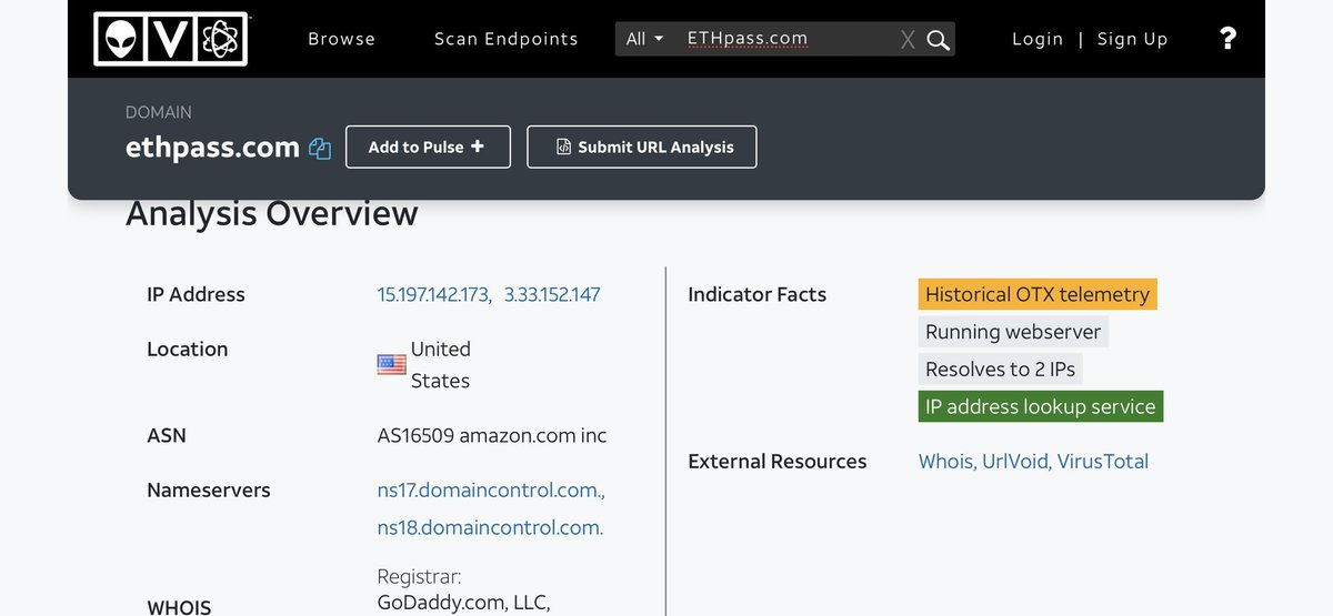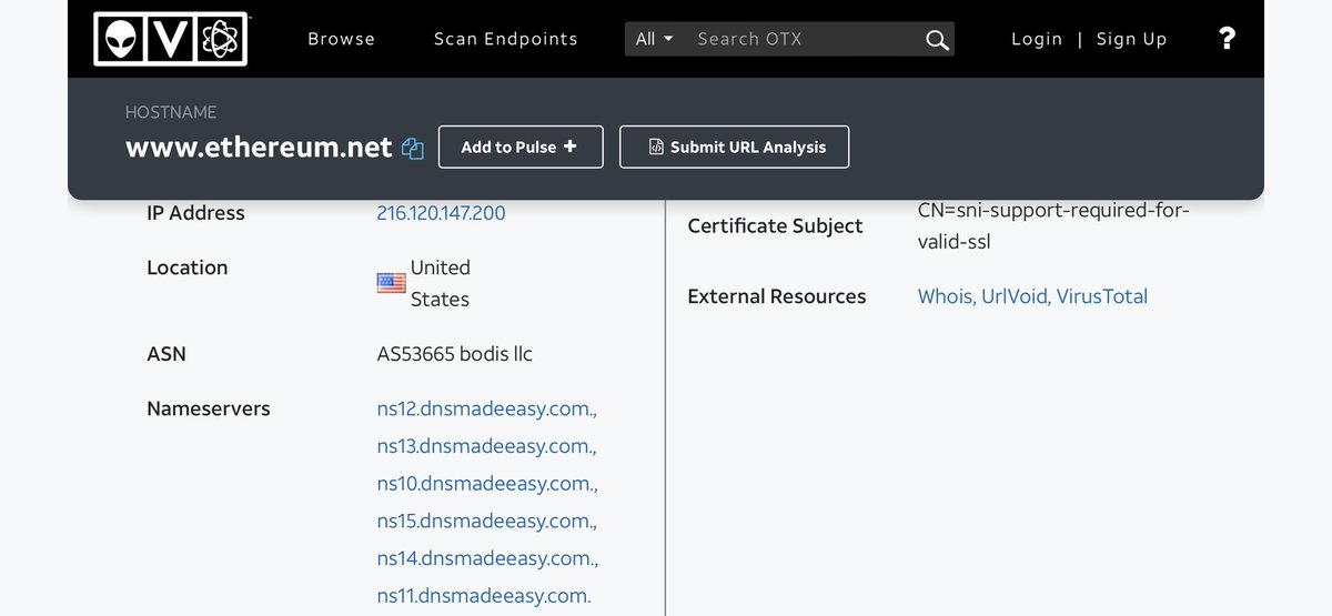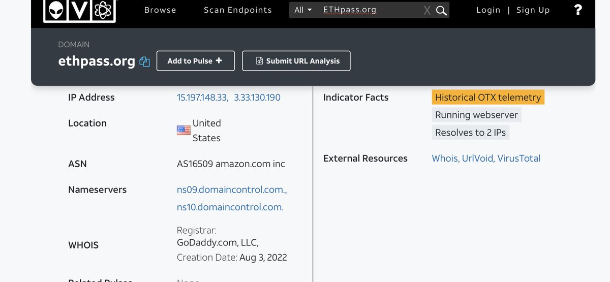 By request, someone had asked us to dig into the whole #ethpass thingy, so I figured… what the hell? Why not? 💥http://ETHpass.com and http://ethereum.net both share Go Daddy email domains and are registered to Domains By Proxy, LLC. in Tempe, AZ. ✅http://ETHpass.com has 2 main IPV4 addresses: 15.197.142.173 3.33.152.147 ✅http://ethereum.net has 1 main IPV4 listed: 216.120.147.200 💥For their ASN, http://ETHpass.com operates within a cookie-cutter http://Amazon.com autonomous system, while http://ethereum.net has an ASN of BODIS, LLC. 💥What the hell is BODIS, LLC.?🤔