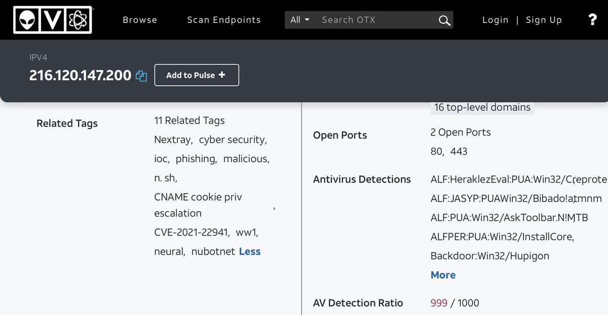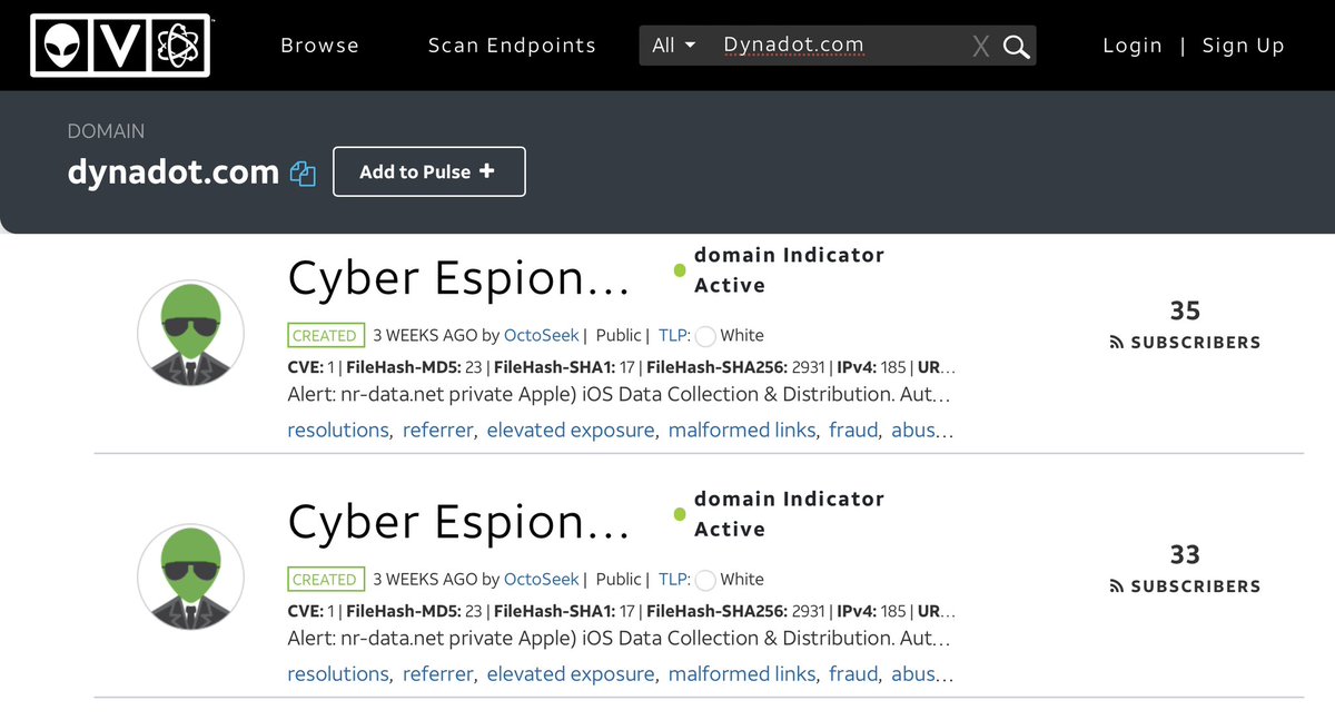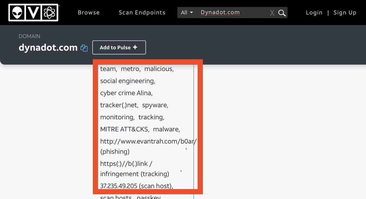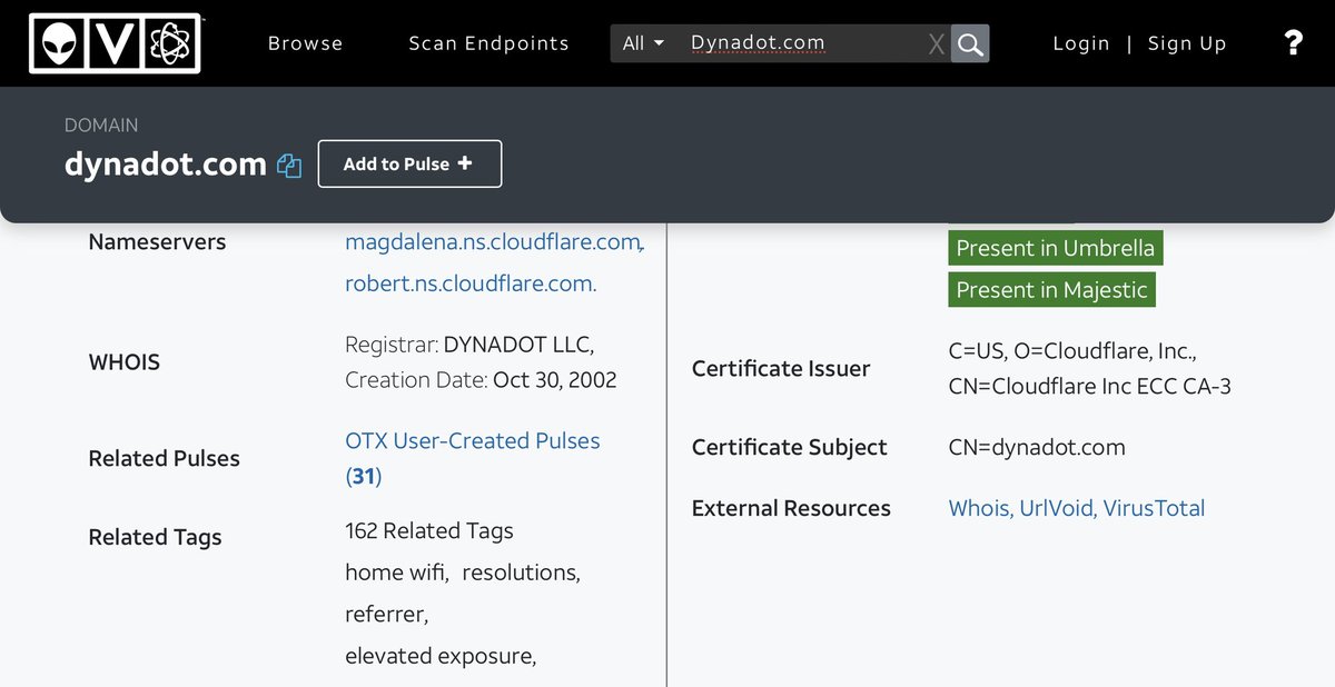 💥Here’s an idea of what you can expect to find within those 31 PULSES for http://DYNADOT.COM! I’m sure having MULTIPLE EXPLOITS labeled “CYBER ESPION…” is nothing to worry about lol. (🤣🤣🤣) 💥See for yourself: https://otx.alienvault.com/indicator/domain/Dynadot.com (What a f***ing time to be alive.)