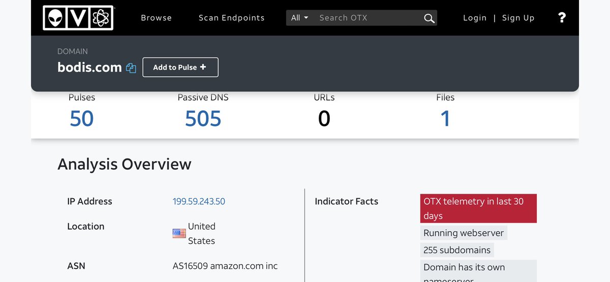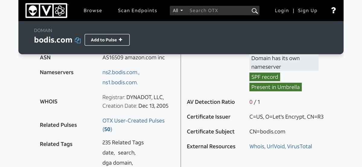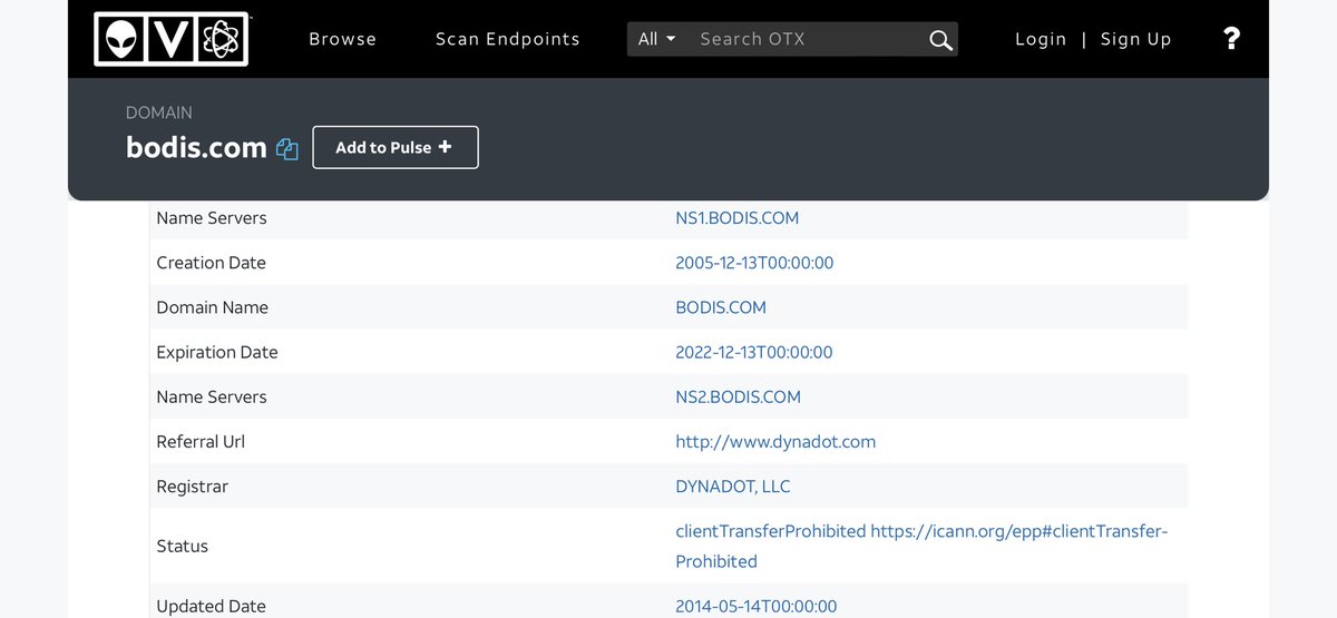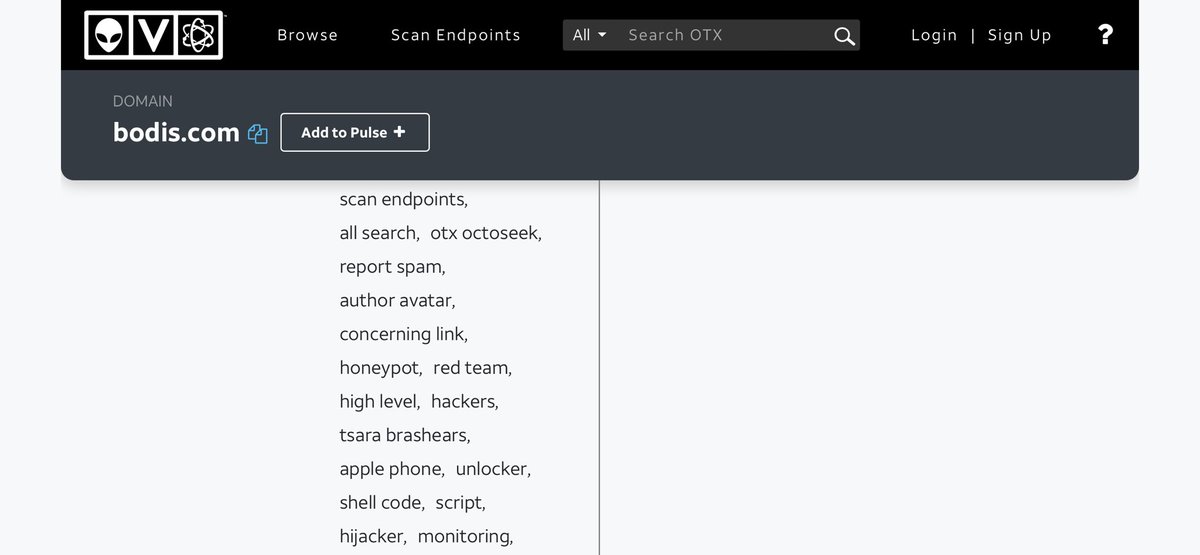 For BODIS, LLC., everything seems pretty normal until you get to the… um… FIRST SCREEN.😳 💥50 domain PULSE RECORDS (EXPLOITS) 💥Registrar (DYNADOT, LLC.)🤔 💥“RELATED TAGS” (honeypot, red team, hackers, Apple phone, unlocker, hijacker, etc.) More to come. Hold that thought…