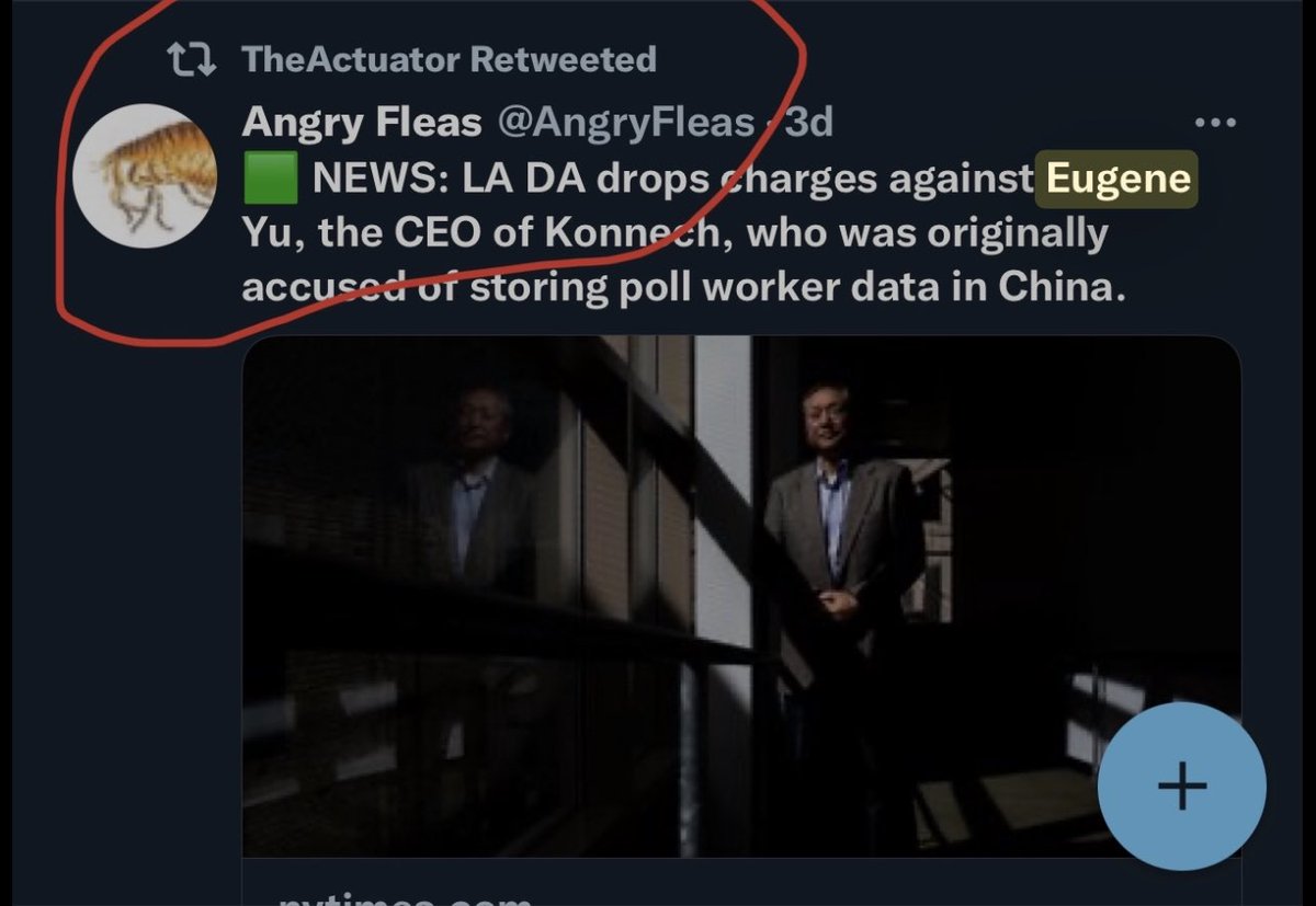 ✅DYNADOT, LLC. also hangs out with KONNECH AND SCYTL (CLARITY ELECTIONS) in ARIZONA’S ELECTIONS!!! ✅And LOS ANGELES’S ELECTIONS!!! ✅And HARRIS COUNTY’S (Houston) ELECTIONS!!! (🤯🤯🤯🤯🤯) @merissahansen17 💥FUN LITTLE TIDBIT: There’s our known CCP-tied homeboy, @AngryFleas! Here he is bragging about that SOROS-backed DA (Gascon) dropping the charges against EUGENE YU of KONNECH too! Gosh, what are the chances???🤣 @KevinMoncla