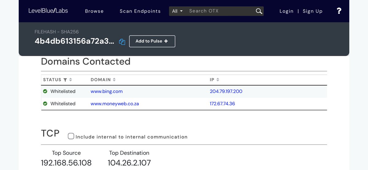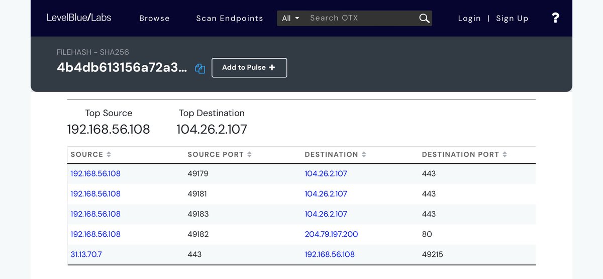 MALICIOUS FILE “4b4db…” DETAILS (104.26.2.107) *9 IPs contacted *2 DOMAINS (WHITELISTED) contacted: http://www.bing.com (204.79.197.200) http://www.moneyweb.co.za (172.67.74.36) *Top SOURCE: 192.168.56.108 *Top DESTINATION: 104.26.2.107 (http://demos.org)