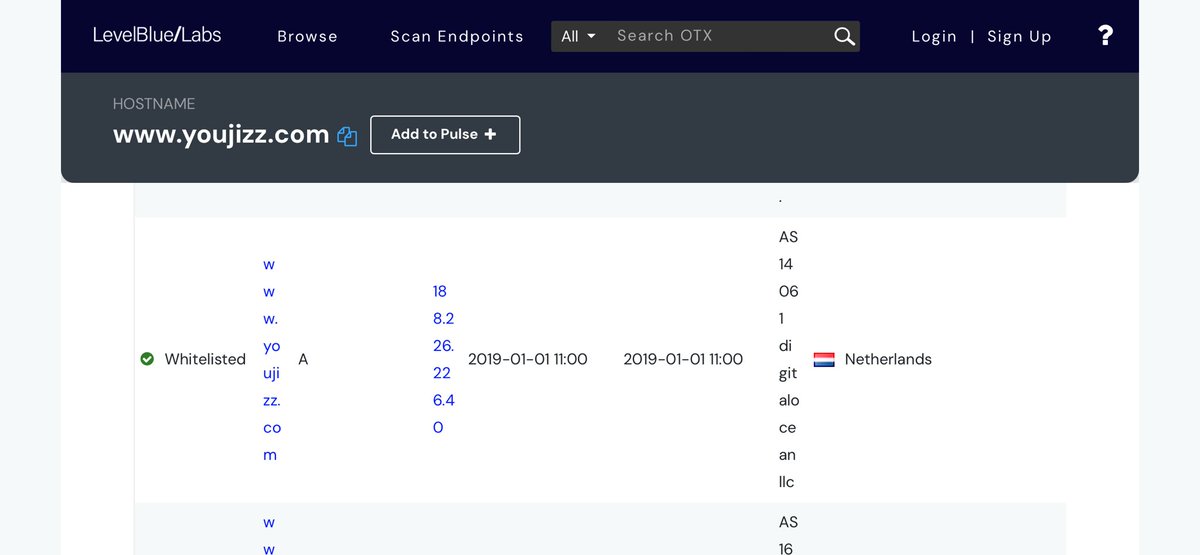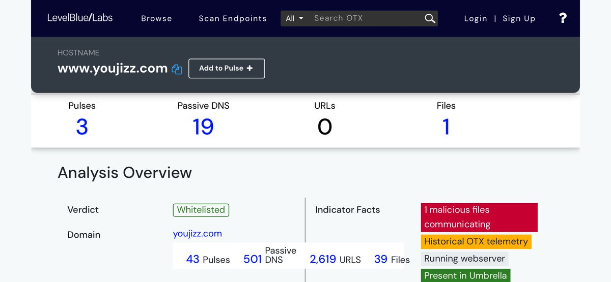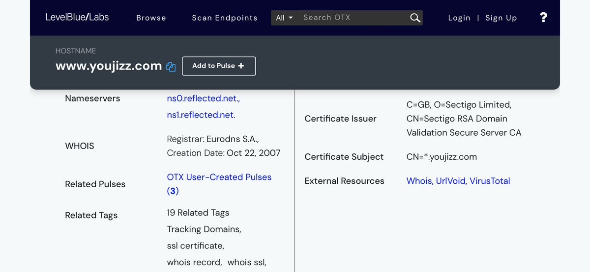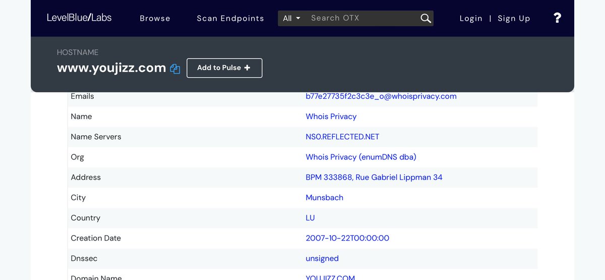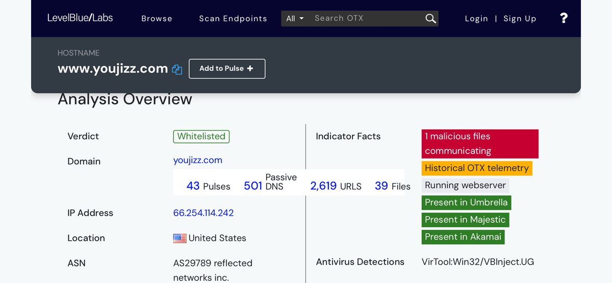 http://YOUJIZZ.COM (disaster) 66.254.114.242 REFLECTED NETWORKS AKAMAI (of course lol) *43 PULSES *39 MALICIOUS FILES *1 MALICIOUS FILE COMMUNICATING *DNS: http://ns0.reflected.net; http://ns1.reflected.net REGISTRAR: EURODNS SA BPM 333868, RUE GABRIEL LIPPMAN 34 MUNSBACH, LU