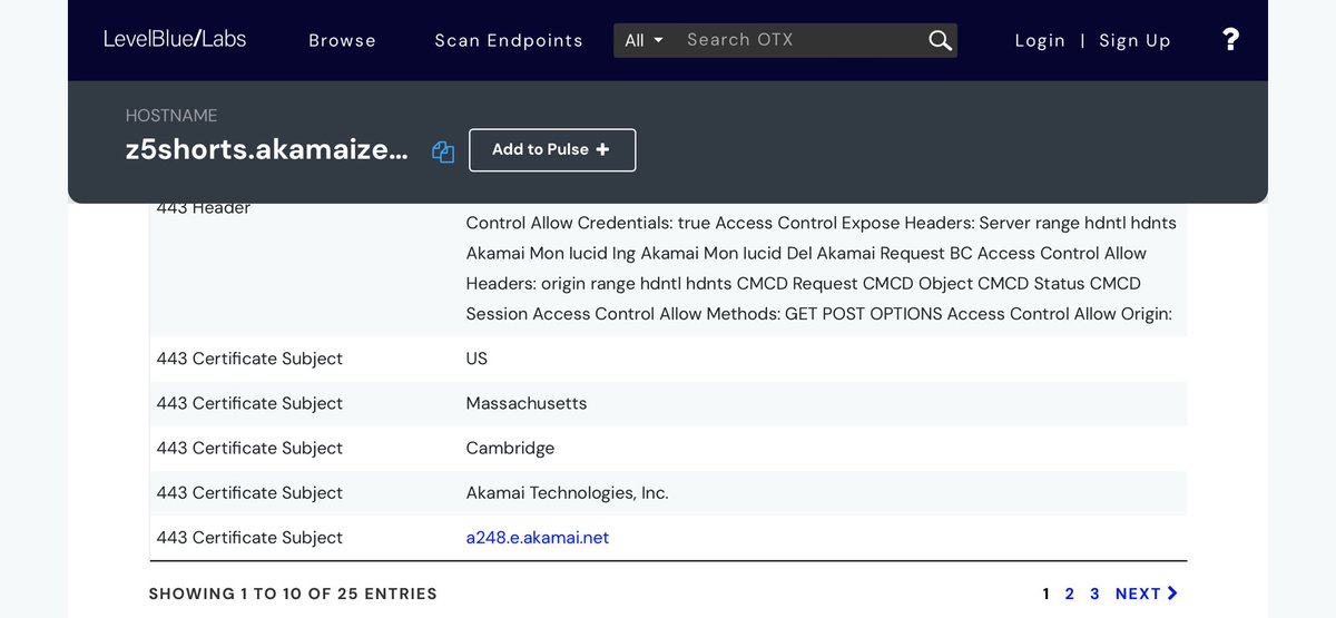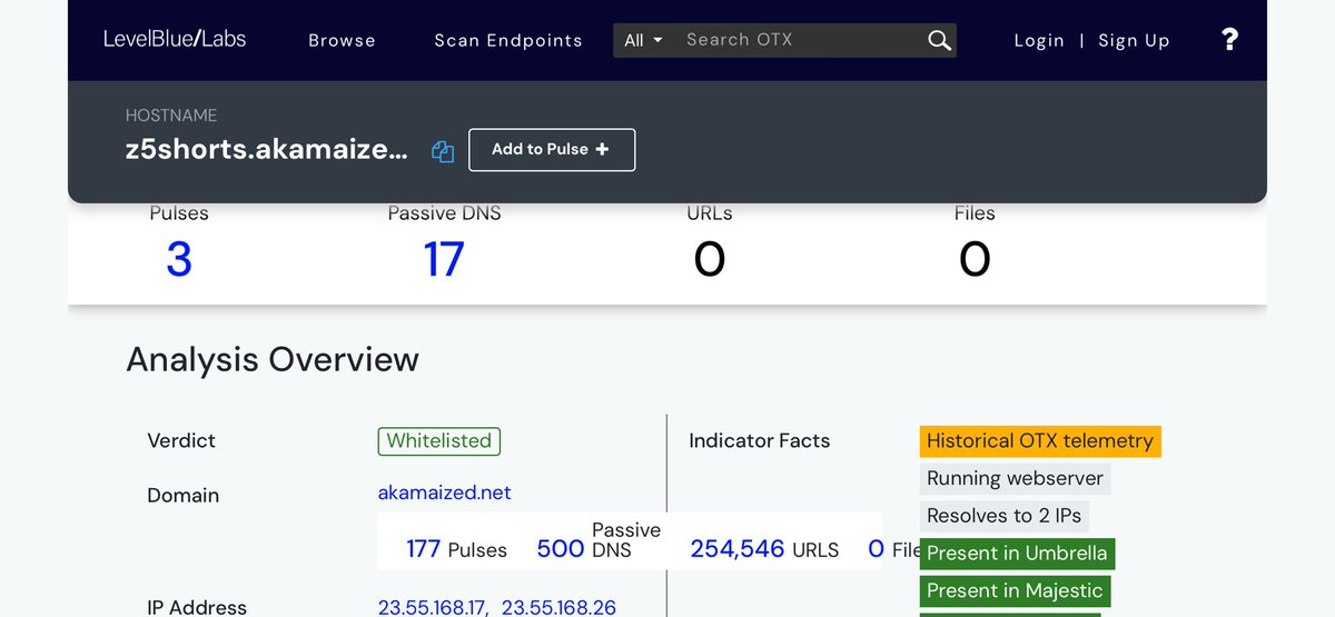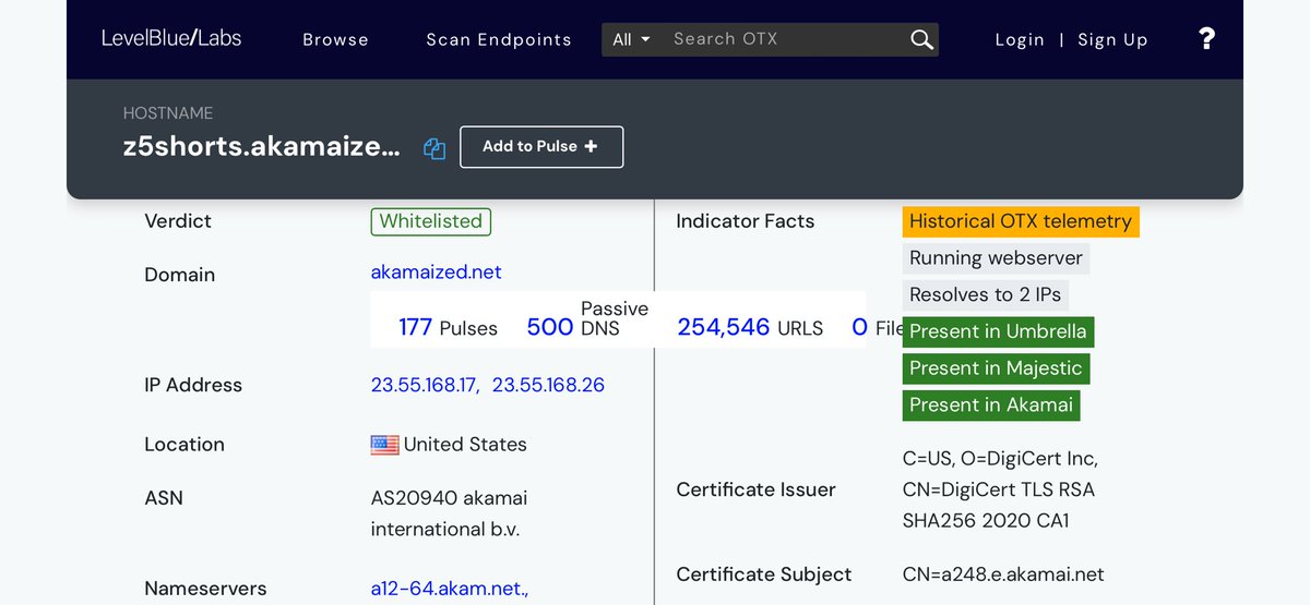 http://z5shorts.akamaized.net (WHITELISTED) *AKAMAI (FBI, CIA, NSA, IDF, MOSSAD, GCHQ) *177 PULSES *2 IP ADDRESSES 23.55.168.17, 23.55.168.26 AKAMAI TECHNOLOGIES INC. CAMBRIDGE, MA *NOTE: It’s almost CERTAINLY tied to recent CERBERUS/INTEL HACKS of BRAZIL BANKS, COVID-19 DATA, etc.