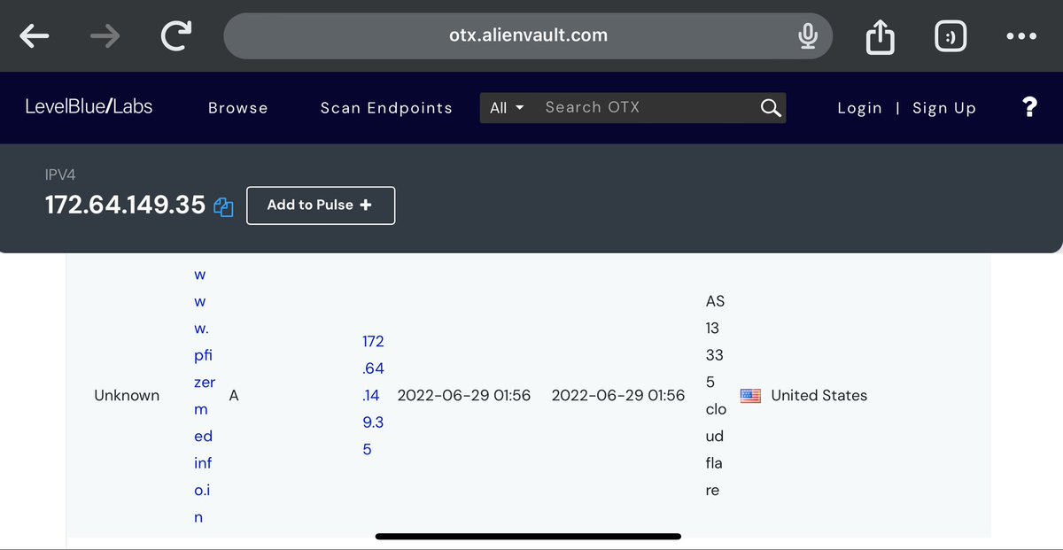 Oh, almost forgot. PFIZER uses that same 172.64.149.35 IP address for MEDICAL INFO too, nbd! http://pfizermedinfo.in (“Pfizer Med Info”) Imagine the FUCK outta that, sports fans.🤦🏻♂️🤬