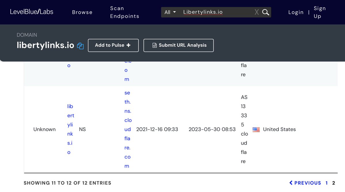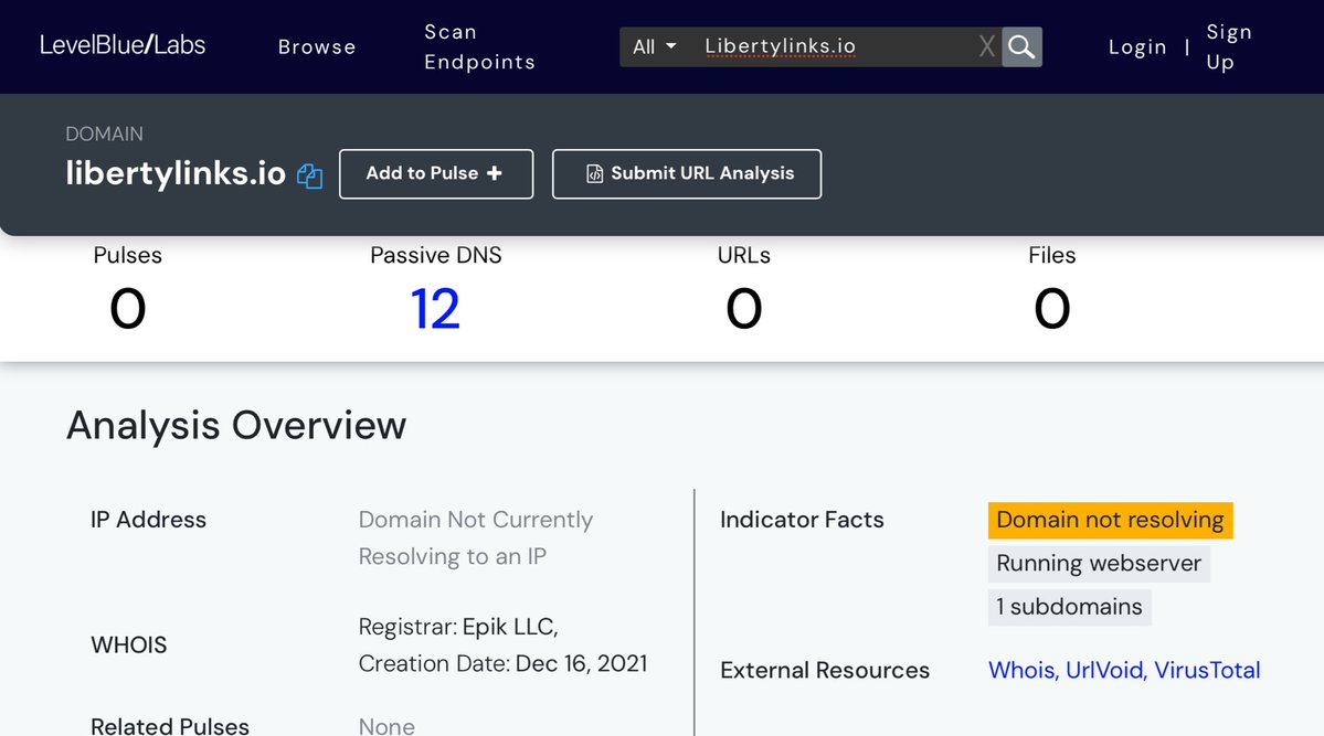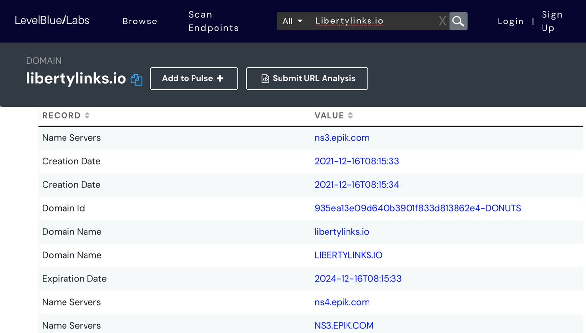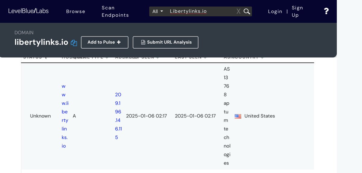 The latest http://libertylinks.io domain, created and last seen on 01/06/2025, uses an IP Address of 209.196.146.115 and an Aptum ASN.