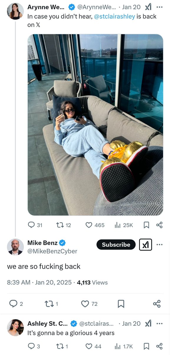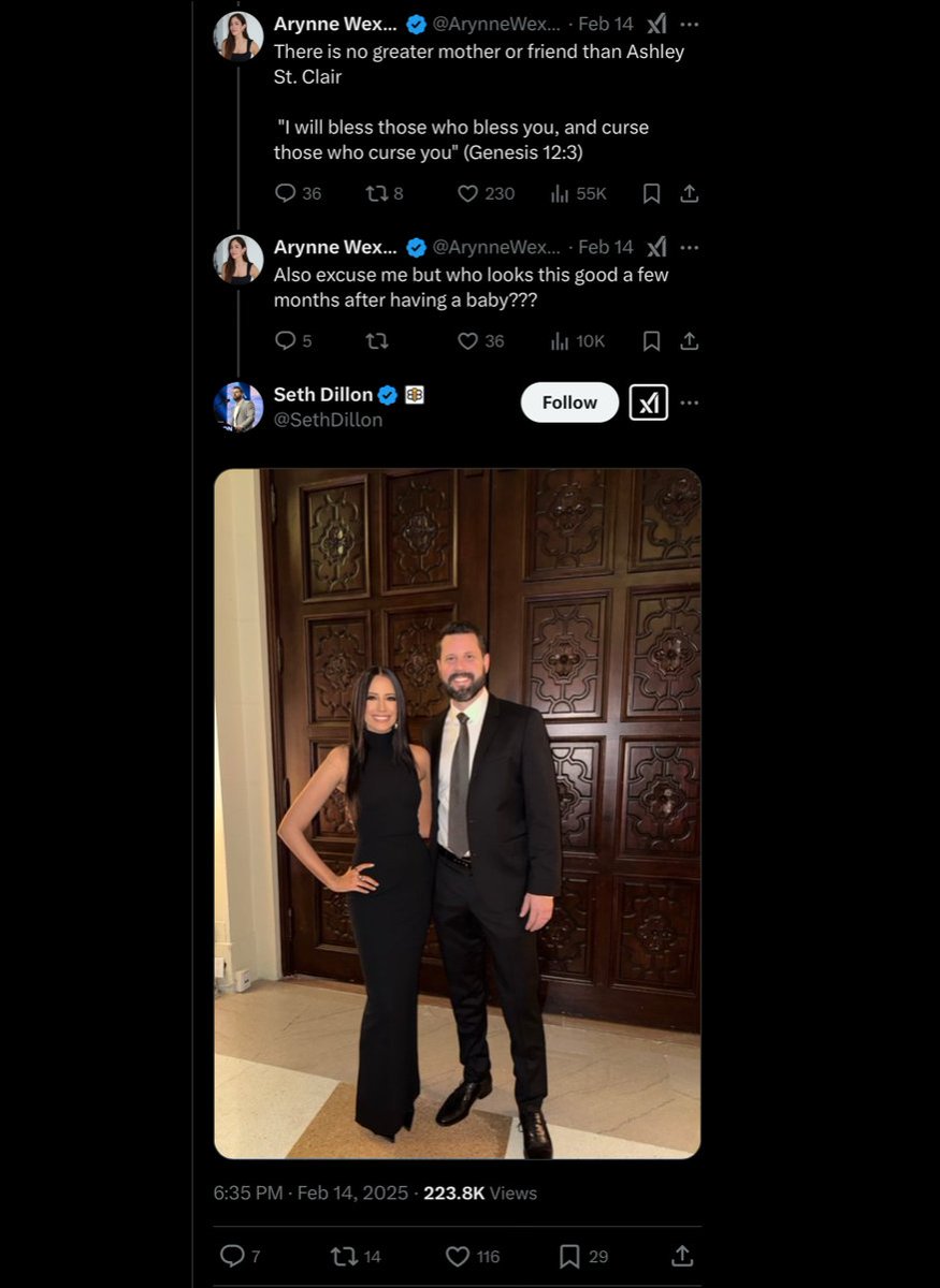 🧵11/ Full Circle So we're supposed to believe that after Arynne Wexler heaped praise upon her close friend Ashley St. Clair on Feb 14th--that then her other close friend Emily Saves America subsequently trashed Ashley, and that that trashing organically found its way into a New York Post article on the 16th? Sure Jan. 🤣 Bonus: Seth Dillon jumping back into the narrative. 👀 Who are these people and what are they up to?