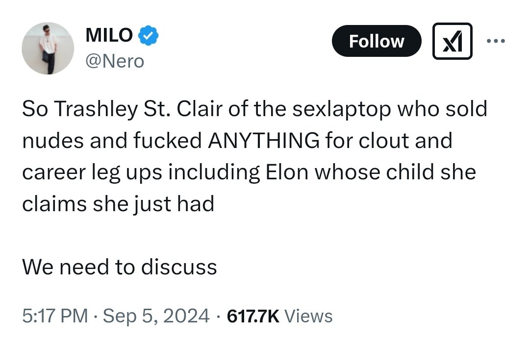 I agree with @LauraLoomer. I wasn’t going to post these, but now that @stclairashley has leaked her private signal messages with @elonmusk after lying and saying she “wanted privacy”, here’s more evidence Ashely planned to baby trap Elon. She sent me these text messages in May 2023 when she first met Elon and started sleeping with him. She said “I need his rocket babies” and “I need a caption to seduce Elon Musk” in May of 2023. See dates below! She doesn’t care about “privacy”. She planned to seduce him by her own admission and now she’s leaking his texts. So I’m leaking her texts to me now. Because as Laura Loomer said below, we need to CONDEMN PROMISCUOUS GOLD DIGGERS! Receipts 👇👇👇