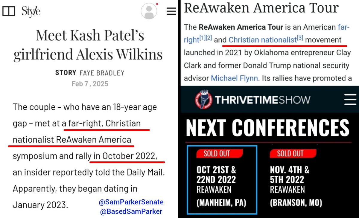 🧵14/ Addendum: How They Met Alexis met Kash Patel at a Christian Nationalist rally called ReAwaken America, launched by General Mike Flynn & prominent Q movement believers. Again, why is a 24-yr devout Christian, hooking up with a Hindu Indian, old enough to be her dad, at a Christian Nationalist conference? Weird.