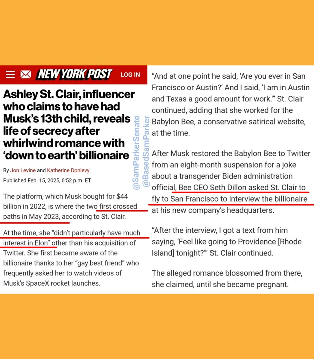 🧵1/ IS ASHLEY ST. CLAIR A MOSSAD HONEYTRAP/"SPARROW?" In the first New York Post article the day after Ashley St. Clair announced her baby with Elon Musk, she claimed that she didn't initially have an "much of an interest in Elon" until after she met him in May 2023 at an interview at Twitter HQ. But there she is on May 2nd, 2023, telling @IsabellaIsMoody that she wants to be funny for Elon in order to have his "rocket babies." This date is important. That meeting with Elon Musk at Twitter HQ was on May 22--3 weeks after telling Isabella she wanted Elon's babies. IOW, she lied in the Post article about not being interested in Elon until after she met him. Strange. It looks like she's constructing a false narrative to make it look like their romance was innocent & spontaneous after having met. Why would she need to do that unless it wasn't actually innocent & spontaneous? But the plot thickens a little more. Seth Dillon, CEO of the Babylon Bee, is the one that facilitated her meeting Elon IRL. He had her fly out for that Babylon Bee interview with Elon, as Ashley noted in the Post article and confirmed by Ashley's own tweet from May 22, 2023. But Ashley wasn't ultimately pictured in the Bee's announcement of the interview with Elon, nor did she participate in the video interview itself at any point. This sort of begs the question: why did Seth Dillon fly her out to meet Elon? Is it because Dillon is part of an israeli influence operation himself as some--including myself--have suggested? What if this entire thing was an israeli sparrow/honeypot entrapment scheme that the Mossad is known to run on powerful people--like it did with Monica Lewinsky on Bill Clinton?