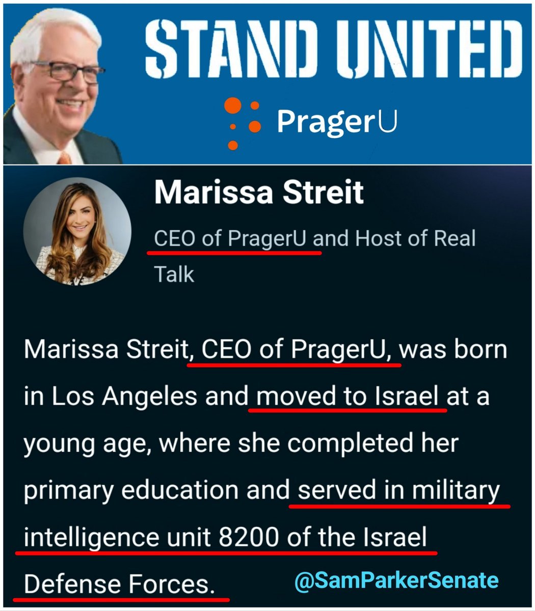 🧵6/ Isreali Influence: PragerU & Daily Wire PragerU is run by Marissa Streit, who served in the IDF Unit 8200 (roughly equivalent to the NSA)--who has sworn an oath of loyalty to israel. IOW, PragerU is an operation of israeli intelligence. Everyone knows about The Daily Wire and where their allegiance belongs.