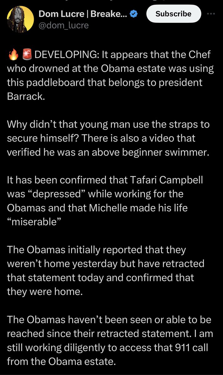 Was Obama behind the accidental drowning of his 45 year old personal Sous chef Tafari Campbell while he was supposedly paddle boarding https://t.co/vI7KoTSeKK