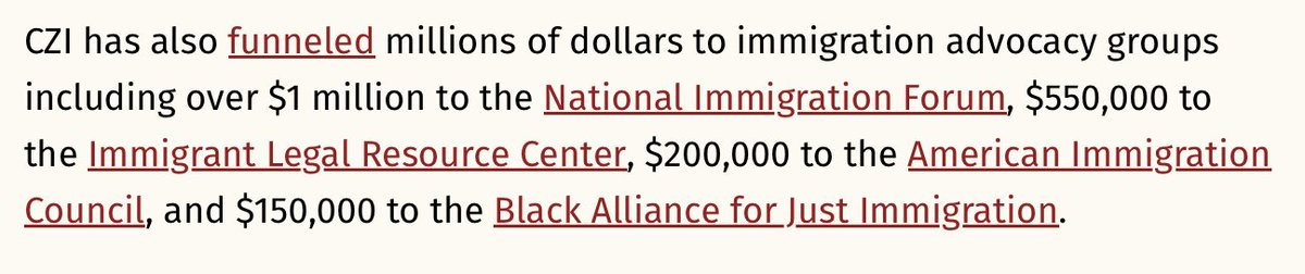 7) CZI has given $200,000 to American Immigration Council, an open borders advocacy group that has criticized Trump’s immigration crackdown as “propaganda” and “fearmongering.” They’ve pledged to fight all his Executive Orders. https://t.co/n8qlRLTBLE