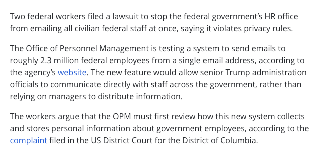federal employees are suing over the idea that the President can email the executive branch https://t.co/VmjuN6FPTK