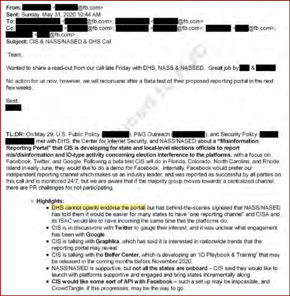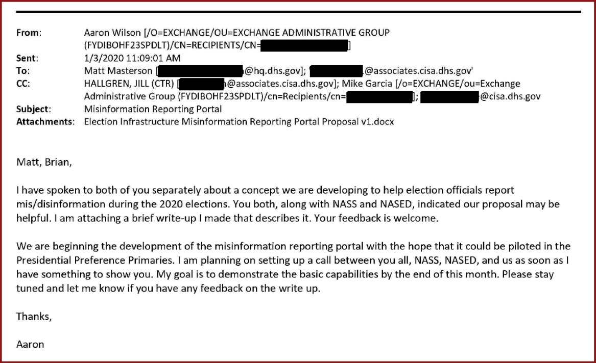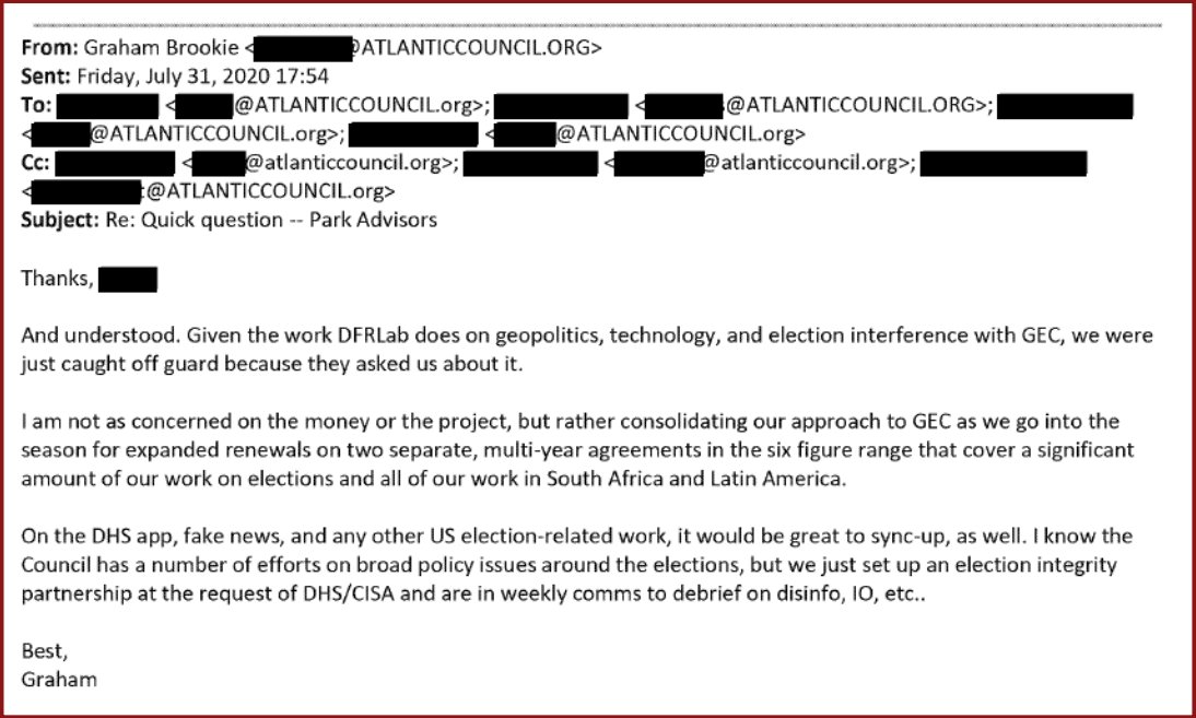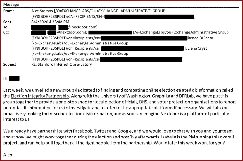 BREAKING: @Weaponization just dropped a MASSIVE 17,000-page report on the Biden Admin's weaponized federal government. Emails reveal an alarming level of collusion between DHS/CISA, Stanford University, the Atlantic Council, and Big Tech to create the "Election Integrity Partnership's" censorship machine. • Graham Brookie of the Atlantic Council's DFR Labs wrote: "We just set up an election integrity partnership at the request of DHS/CISA." • A redacted Facebook executive spilled the beans in an email about a call with DHS, saying: "DHS cannot openly endorse the portal." • Alex Stamos of the Stanford Internet Observatory emailed NextDoor executives: "We already have partnerships with Facebook, Twitter, and Google, and we would love to chat with you and your team." This is some next-level dystopian sh*t. So how does the Trump admin make sure this BS doesn't happen again?
