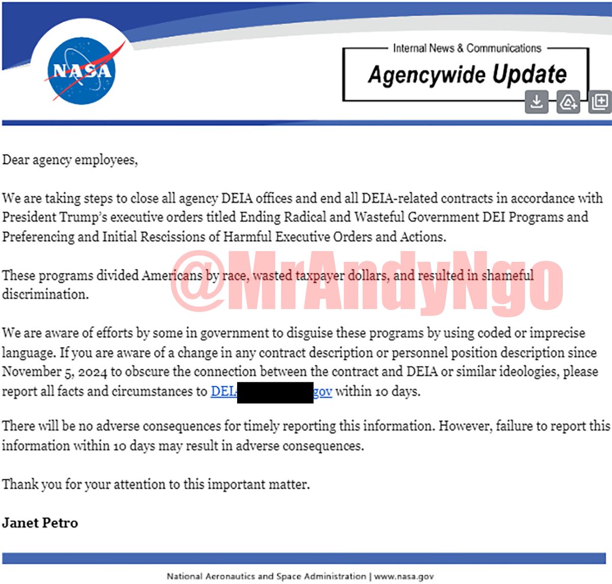 New: Janet Petro, the President-Trump-appointed acting director of NASA, has sent a message informing all NASA staff that it is shutting down all DEI offices and DEI contracts. The message says the agency knows government employees are trying to disguise DEI by using new names and vague language. (This is documented.) It tells staff to report those violations for investigation.