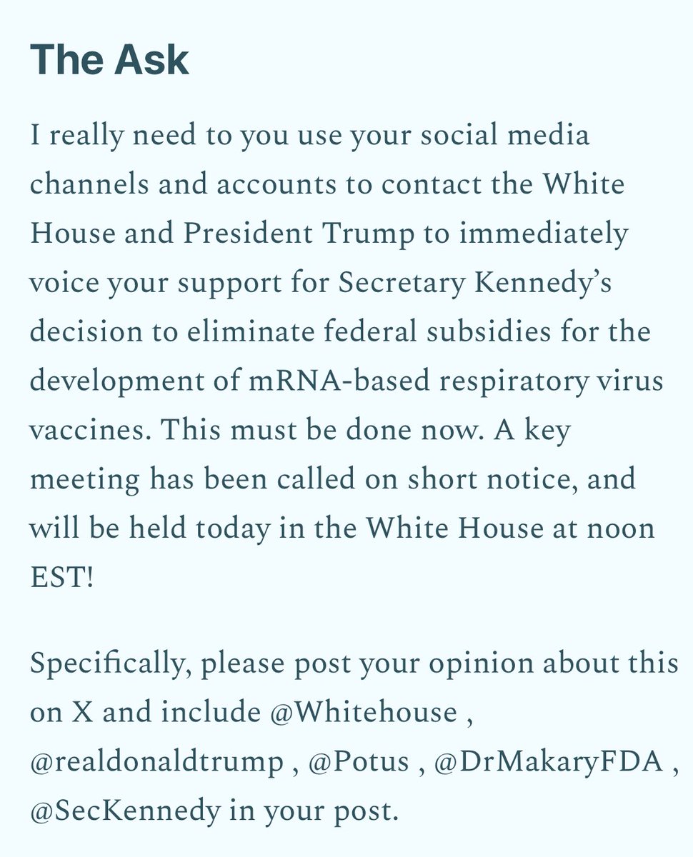 RFK Jr. NEEDS your help! The mRNA lobby is in full meltdown, pressuring Trump to overturn RFK’s decision to end funding for mRNA vaccines. Now MAHA insiders are calling on you to speak up. “The Secretary needs your support now, more than ever.” Short thread🧵 https://t.co/CNyCtrP450