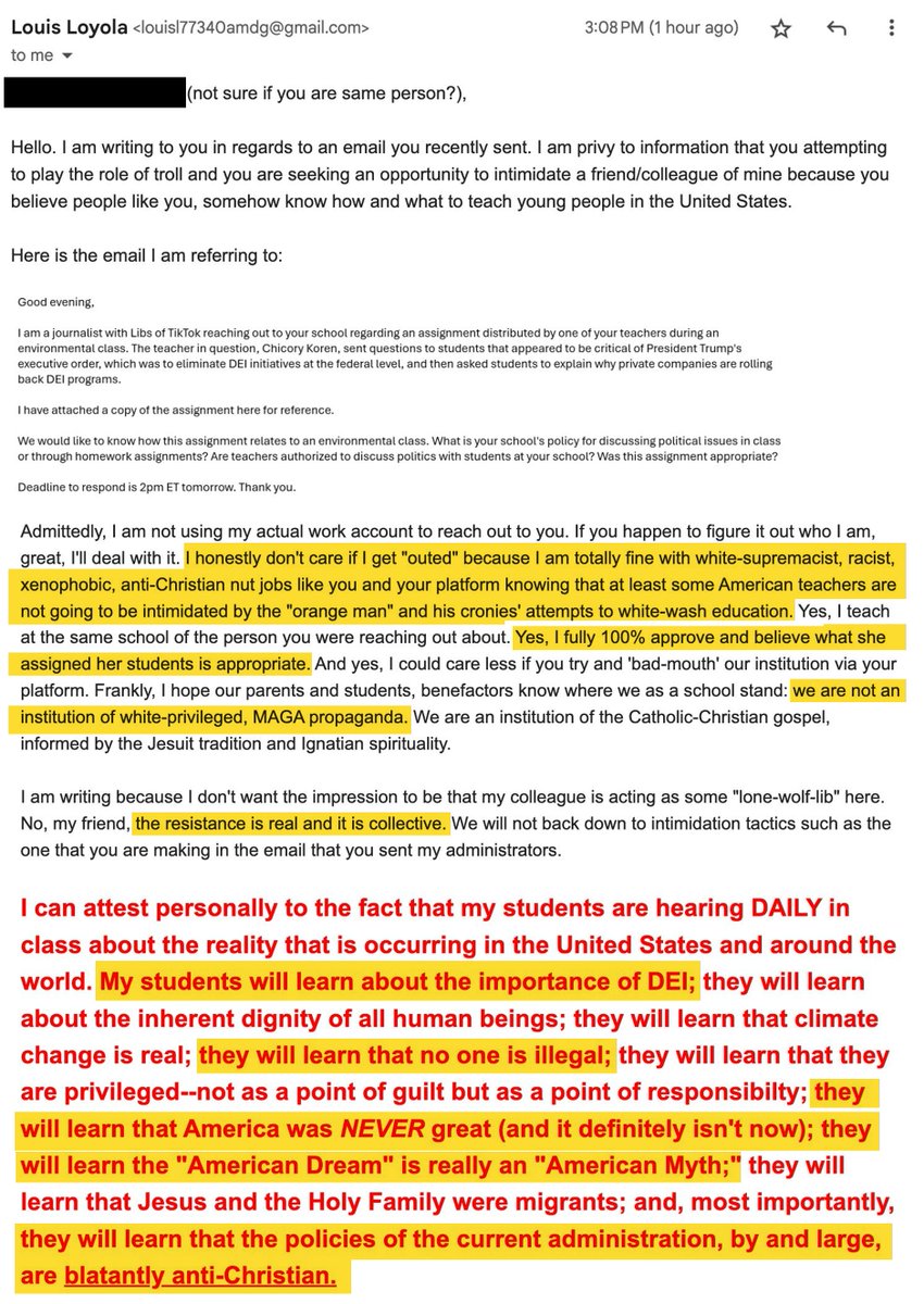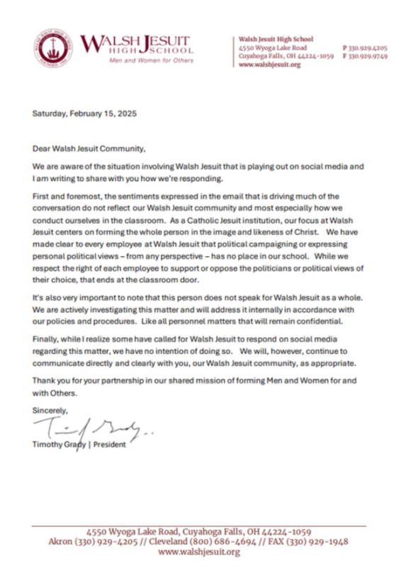 UPDATE: @WalshJesuit sent a letter to families condemning the unhinged email sent anonymously by one of their staff members stating that political commentary by teachers "has no place in our school." The school also announced they are opening up an internal investigation into the matter but will not be making any public statements on this controversy. After exposing the email, @WalshJesuit locked down all of their social media accounts and blocked us.