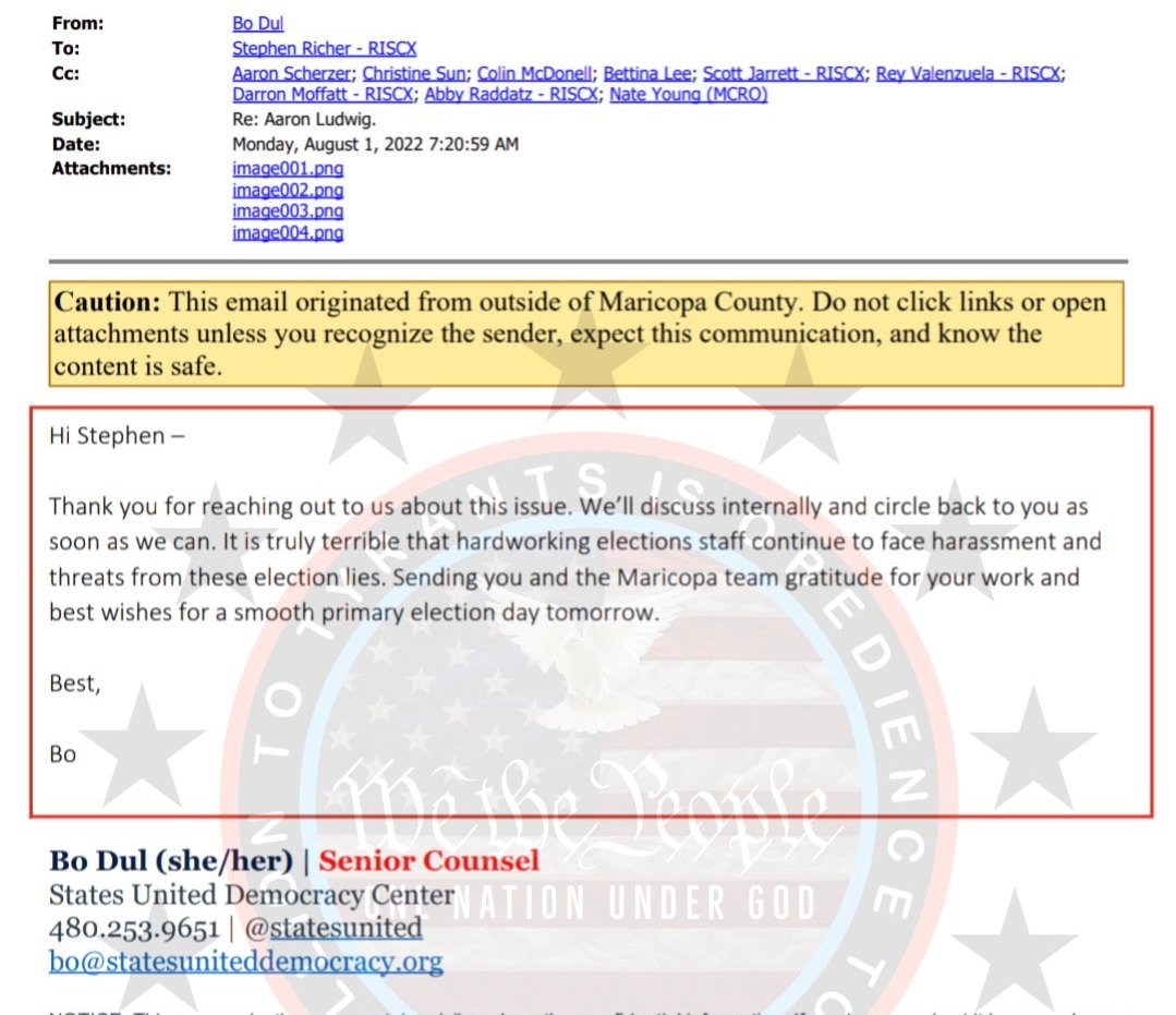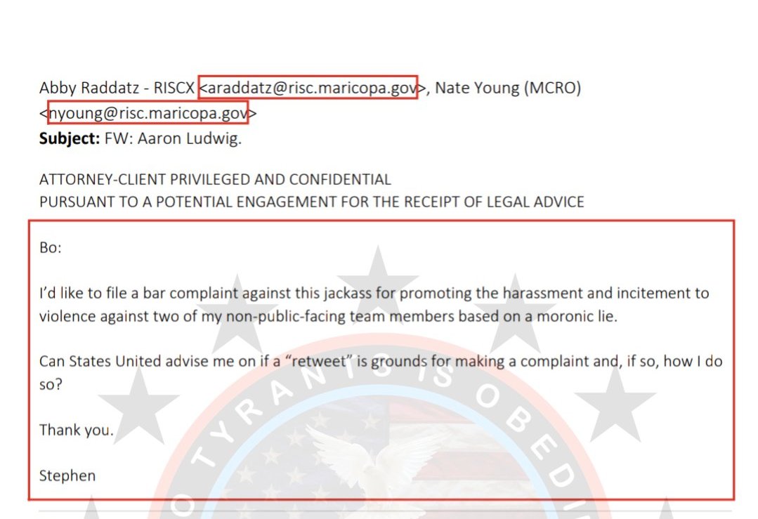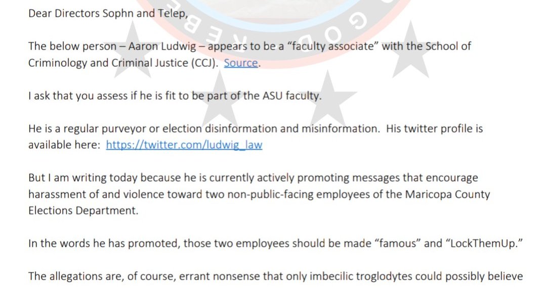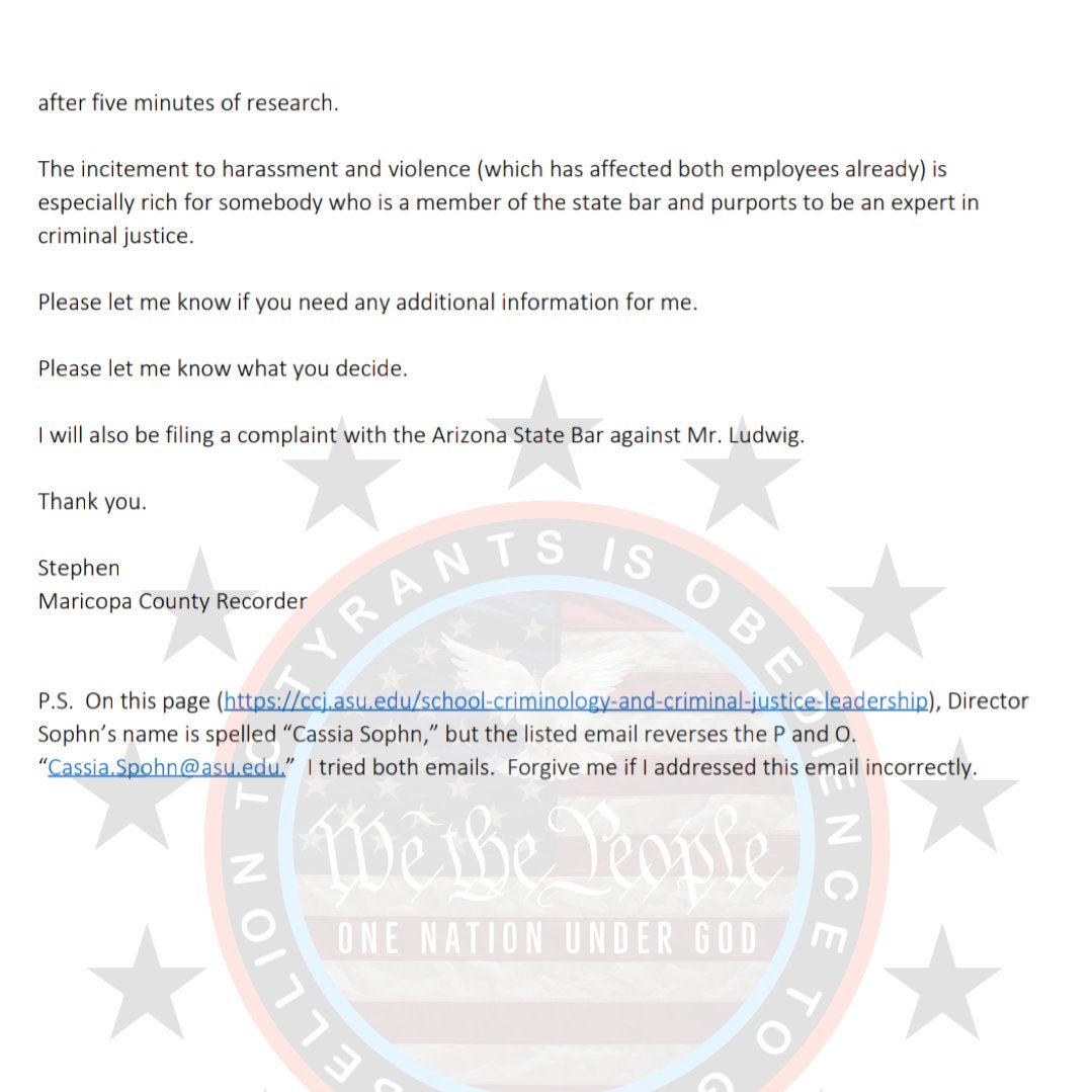 Recorder Stephen Richer contacted Arizona State University and demanded Ludwig's firing, "I ask that you assess if he is fit to be part of the ASU faculty." "He is a regular purveyor of election disinformation and misformation." Someone put this sick, gingered tyrant in jail and throw away the keys. All these emails were obtained by @WethePeopleAZA1.