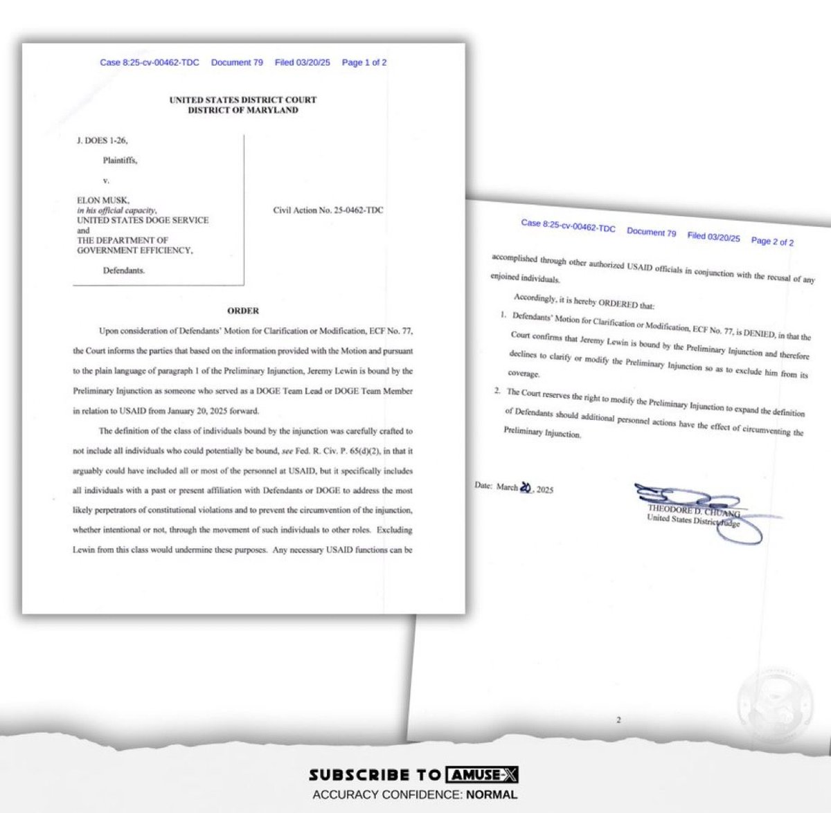 🚨🇺🇸 FEDERAL JUDGE TAKES OVER USAID HIRING — BLOCKS TRUMP PICK Judge Theodore D. Chuang has barred Jeremy Lewin, a former DOGE team member, from becoming Deputy Administrator of USAID. Instead of letting the administration make its own staffing decisions, Judge Chuang decided Lewin’s loyalty to Trump disqualified him. Government lawyers asked for clarity — the judge flat-out denied it and warned he could expand the ban if they try any workarounds. In effect, one judge is now acting as the self-appointed HR department for the federal government... Source: @amuse