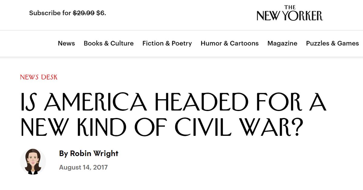 "...the United States faces a sixty-per-cent chance of civil war over the next ten to fifteen years. Other experts’ predictions ranged from five per cent to ninety-five per cent. The sobering consensus was thirty-five per cent. And that was five months before Charlottesville."