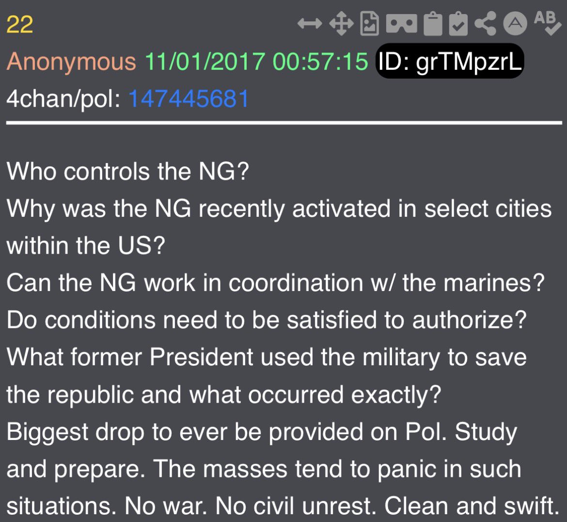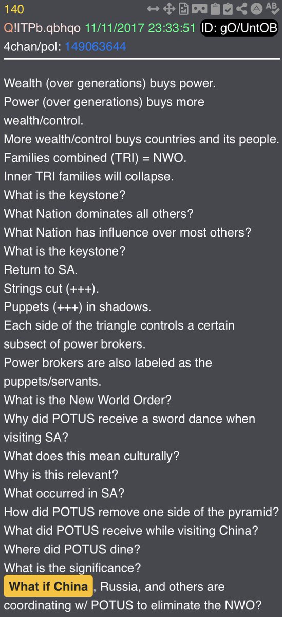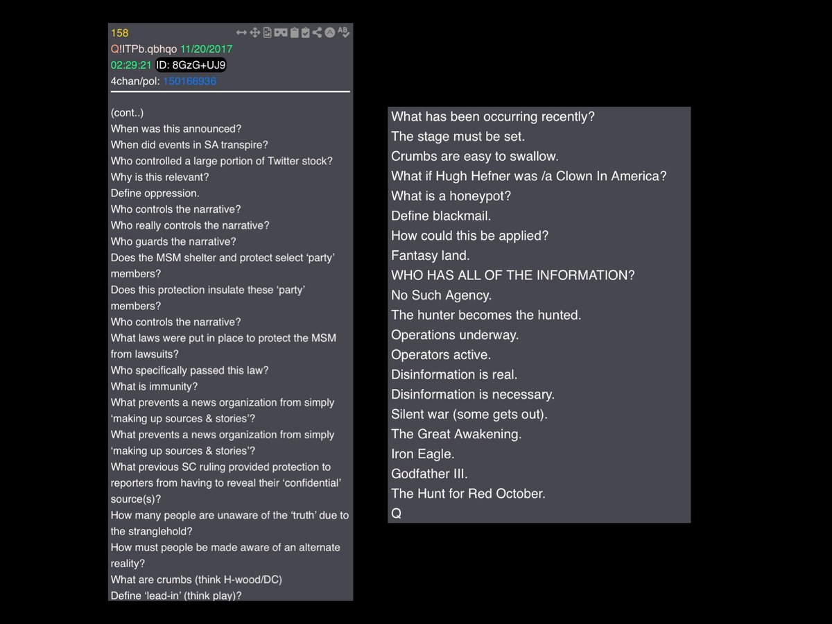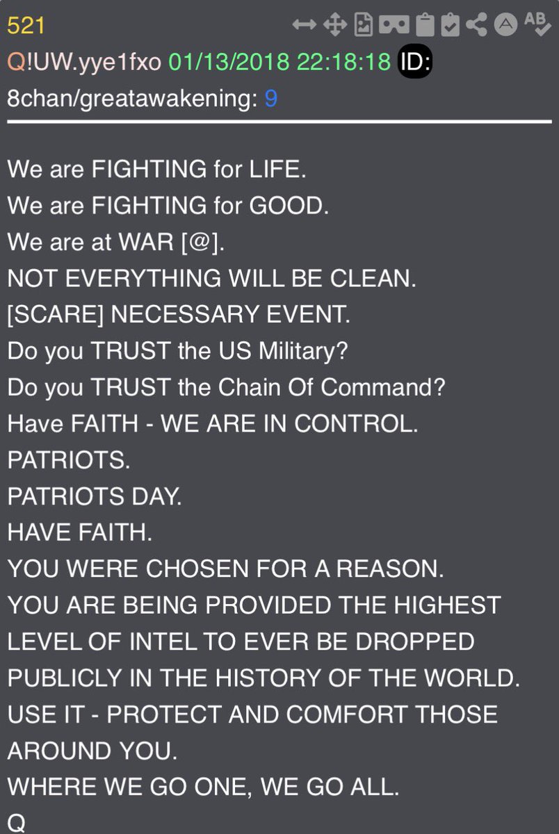 Enter Q - October 28, 2017: 🧵 24 of 50 What if the first Q drop wasn’t just intel but a public activation signal to the world that the Great Information War has started? What if Anons and the Digital Soldiers were mobilized and activated to take part in this fight? What if this is more than an information war? What if this is a Spiritual War of “Good vs Evil”? What if TRUTH is our sword and awareness is our shield? What if we fight for humanity one mind at a time, as “We take this journey together. One step at a time.”?