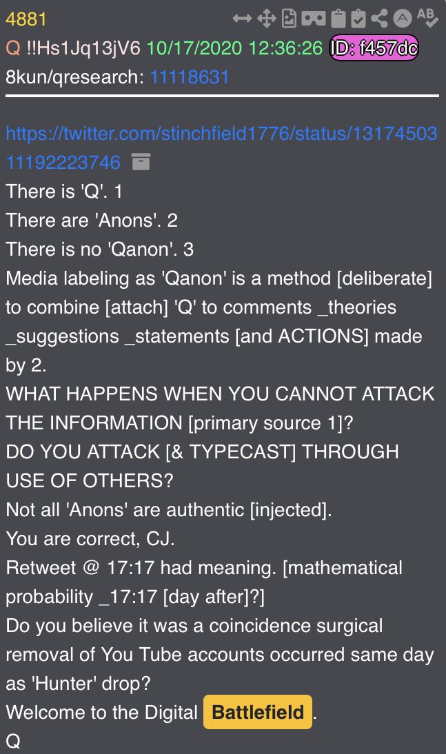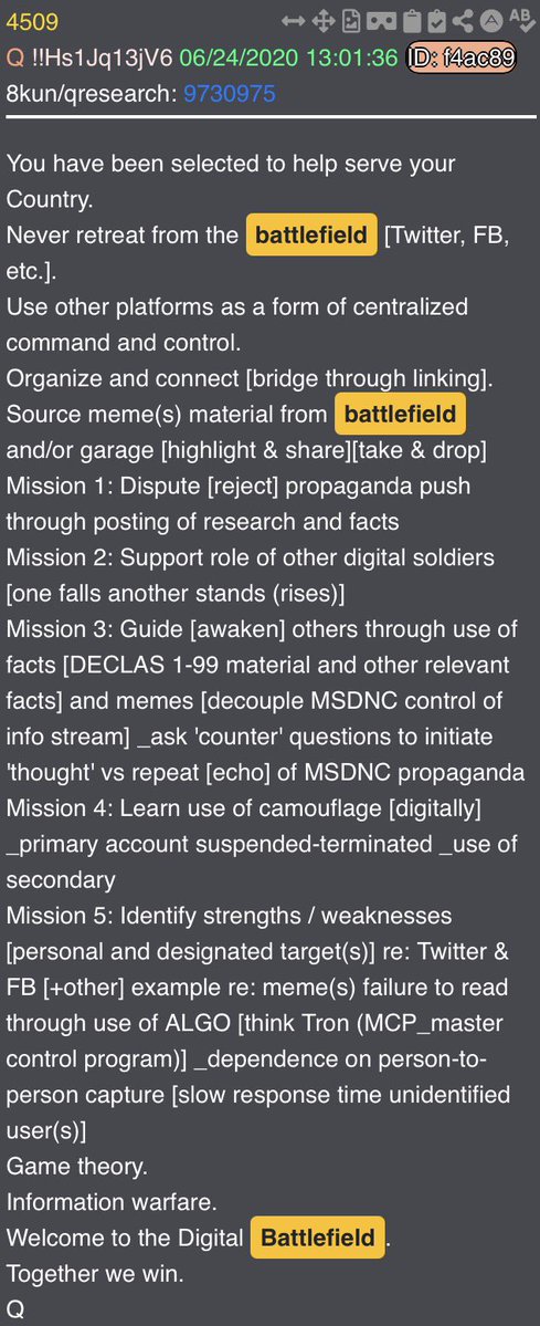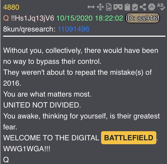 “You’re already on the battlefield. The choice is yours.” There are multiple drops that come to mind just based on that sentence alone. 4881 says “Welcome to the Digital Battlefield” at the end. But up top? This is the drop that tells us there is Q, there are Anons, but there is no “Q-Anon”. Drop 4880 essentially delivers the same exact message General Flynn delivered at the beginning of the video. And then of course there is drop 4509 which instructs us to never leave the battlefield. It also makes mention of game theory, which also ties into General Flynn’s mention of 5GW.