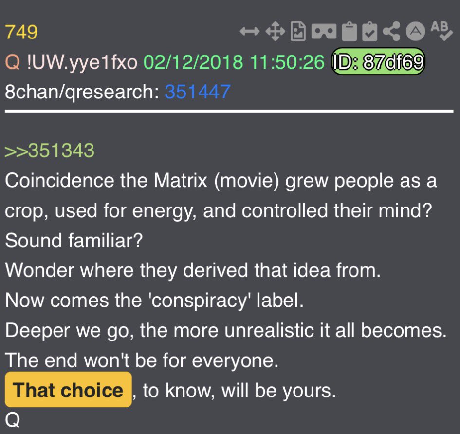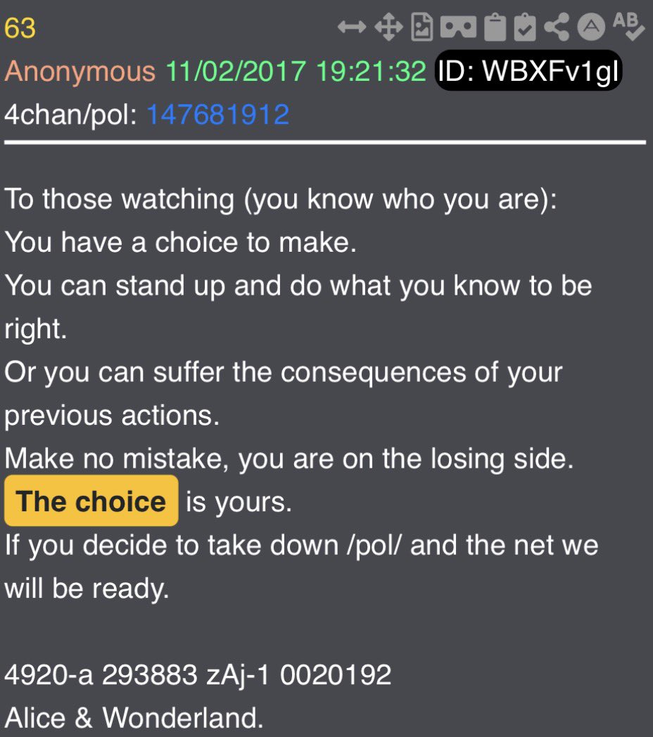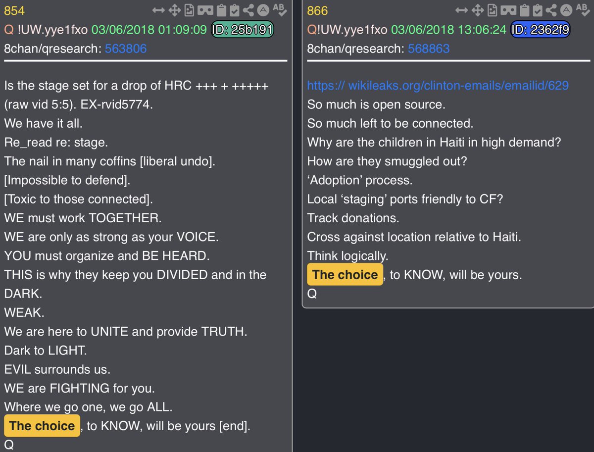 in 854 & 866 Q says “the choice to know will be yours”. Important to note that both of these drops are dealing with Hilary Clinton, and crimes against children. Drop 749 says “That choice, to know, will be yours” - and that is in reply to the line above in which Q says the deeper we go, the more unrealistic it all becomes, and that “the end won’t be for everyone”. Call me crazy, but I’m pretty sure we are reaching that point now. Recent events seem to bring that point home even harder. There are a total of 18 drops which state “the choice will be yours” in one way or another. I’m pretty sure it was not a coincidence that General Flynn chose that wording. Pairing up with mention of being “on the battlefield” makes it even more noteworthy to me as it relates to the drops.