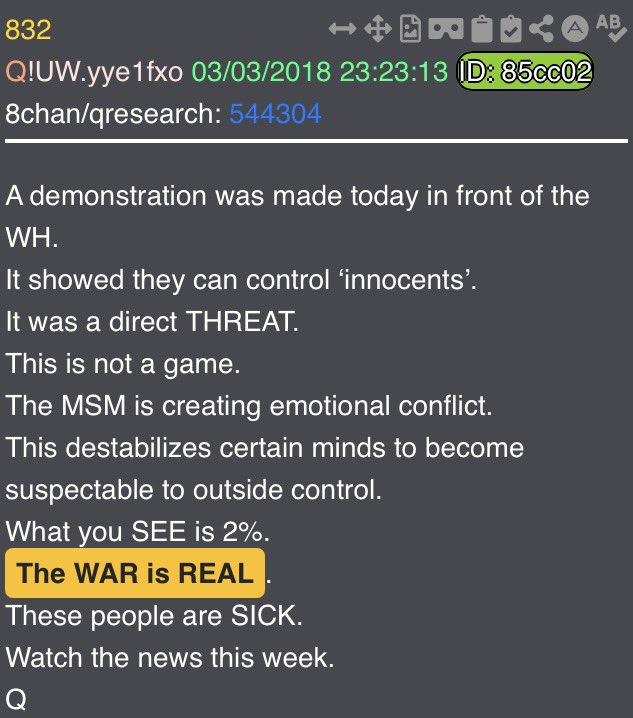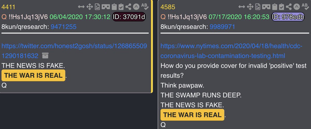 At the 1:27 mark, the lyrics in the song say “this is warfare” - do we recall how many times President Trump has said he is a “war time President”? I don’t know how many exactly - but it’s a lot. Drop 832 came to mind here, and Q telling us that the war is real. Q also makes mention of the MSM “creating emotional conflict” - which is, again, exactly what we are seeing today. 4411 & 4585 also tell us the war is real, both times after telling us that the news is fake. Q makes mention of this particular phrase (the war is real) a total of 10 times.