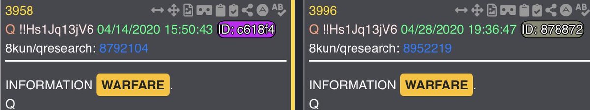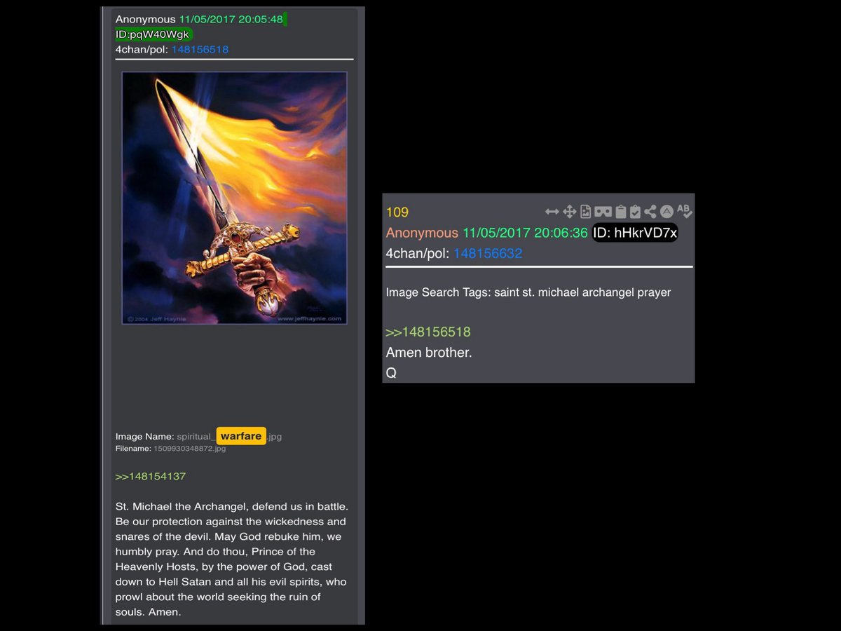 “But wait Abs! The song said this is warfare!”. Why yes, yes it did. So what does Q say about “warfare”? Drop 109 includes an image titled “spiritual_warfare”, as well as a prayer to St Michael. Drops 3958 & 3996 make mention of “information warfare” - which, again, is part of the message General Flynn delivered at the beginning of the video. Along with these, there are 37 other drops which mention “information warfare”