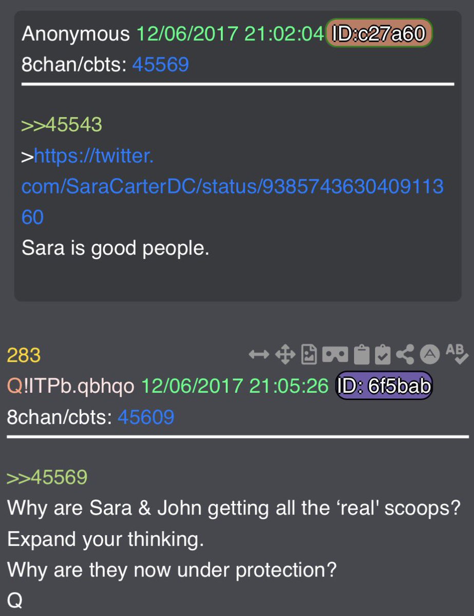 At the 1:36 mark, we get a very quick shot of John Solomon and Sara Carter. Allow me to point you towards drop 283. The John & Sara being referenced here are John Solomon and Sara Carter, and Q is letting us know that they are trustworthy journalists.