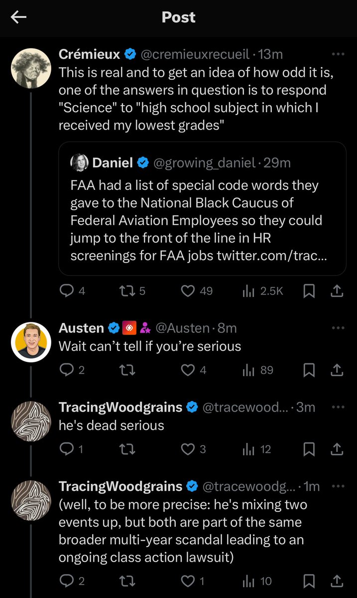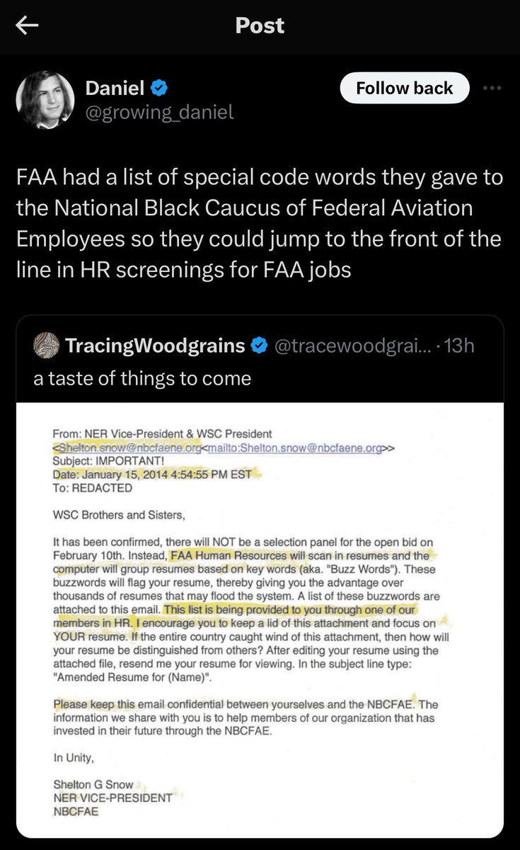 This is one of the craziest things I’ve ever read. First, the FAA gave secret code words to students in the Black Caucus of Federal Aviation Employees to put in their resume that would skip them to the front of the line. In another instance of the signals to go to the front of the line was to say the high school class you received your lowest grades in was “Science.” Yes, they literally shot you to the front of the line if you said your worst grades were in Science.