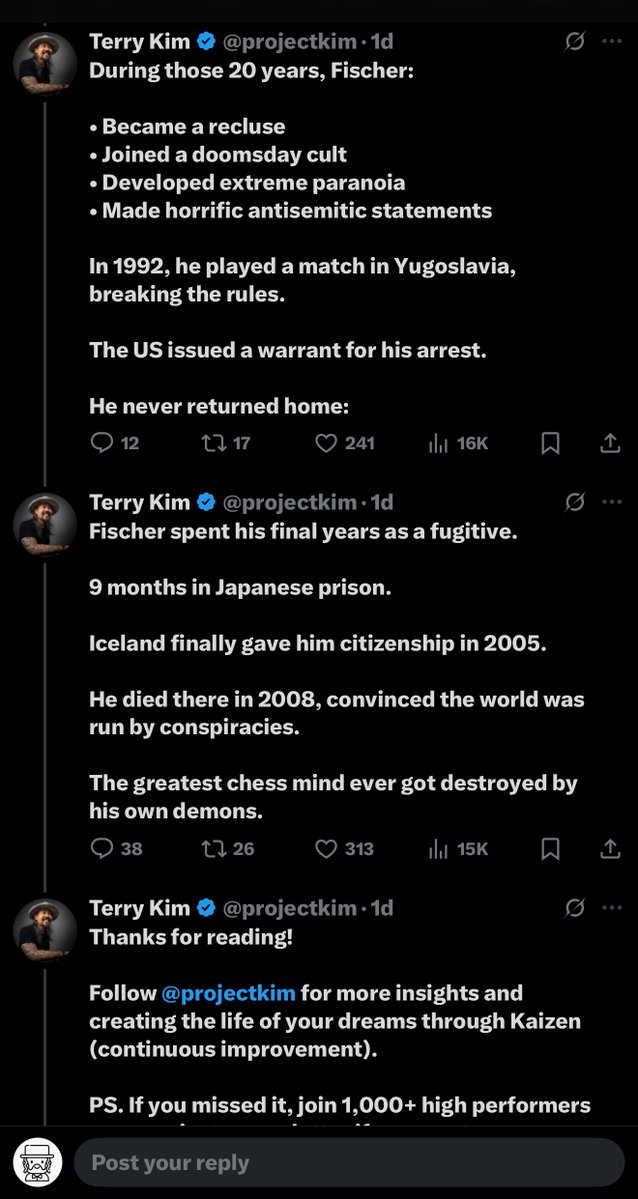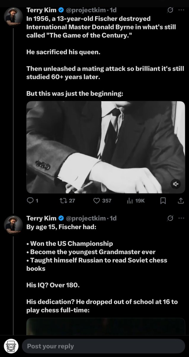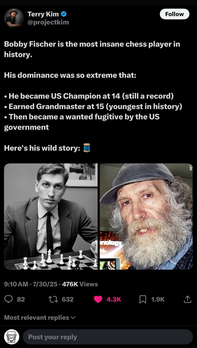 “I dOn’T bElIeVe HiGh Iq PeOpLe AcTuAlLy HaVe TrOuBlE fItTiNg InTo SociEtY.” -Some retardanon “Bobby Fischer was the most insane chess player in history… His IQ? Over 180.” “During those 20 years, Fischer: •Became a recluse •Developed extreme paranoia •Made horrific antisemitic statements Iceland finally granted him citizenship in 2005. He died there in 2008, convinced the world was run by conspiracies. The greatest chess mind ever got destroyed by his own demons.” -Terry Kim, NexGenT ALSO TERRY KIM, NEXGENT… “A bit about me: I’m a YC-backed founder, and my coaching business now makes $1m/month.” 🚨NOTE: Y Combinator is the gatekeeping apparatus in Silicon Valley run by Jews (American and Israeli) and their CCP co-investors/founders, where Tech founders have to “kiss the ring” to make it as a startup, while managing to not have their IP stolen outright by the Unit 8200, Bilderberg, PayPal Mafia, Kleiner Perkins and CIA Jews who run it. (Sam Altman is/was the President of YC.) What a motherfucking time to be alive, folks.🤣