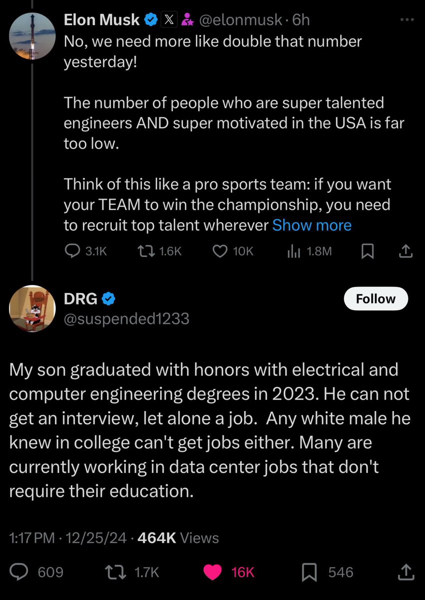 The results of going to legal war with nature and the differences in human capabilities it created are predictably South African California is on fire because of incompetence and the lesbian DEI commissar is on tape describing how she won’t rescue men from burning buildings Young white guys have trouble getting into college, effectively a requirement for good work because it fills (in expensive fashion) the purpose of the IQ tests that used to be used, and thus unable to get good work. They’re then berated for not pulling themselves up by the bootstraps, despite being legally forbidden from doing so, as we saw during the discussion surrounding H1bs Speaking of, companies being over multitudes of H1bs to fill diversity quotas with those who are at least marginally competent, which depresses wages and exacerbates the work issue All that and much, much more has turned America into a low trust country in which the tap water is often dangerously filthy, crime is high and getting higher, and deaths of despair are ever more common amongst white men